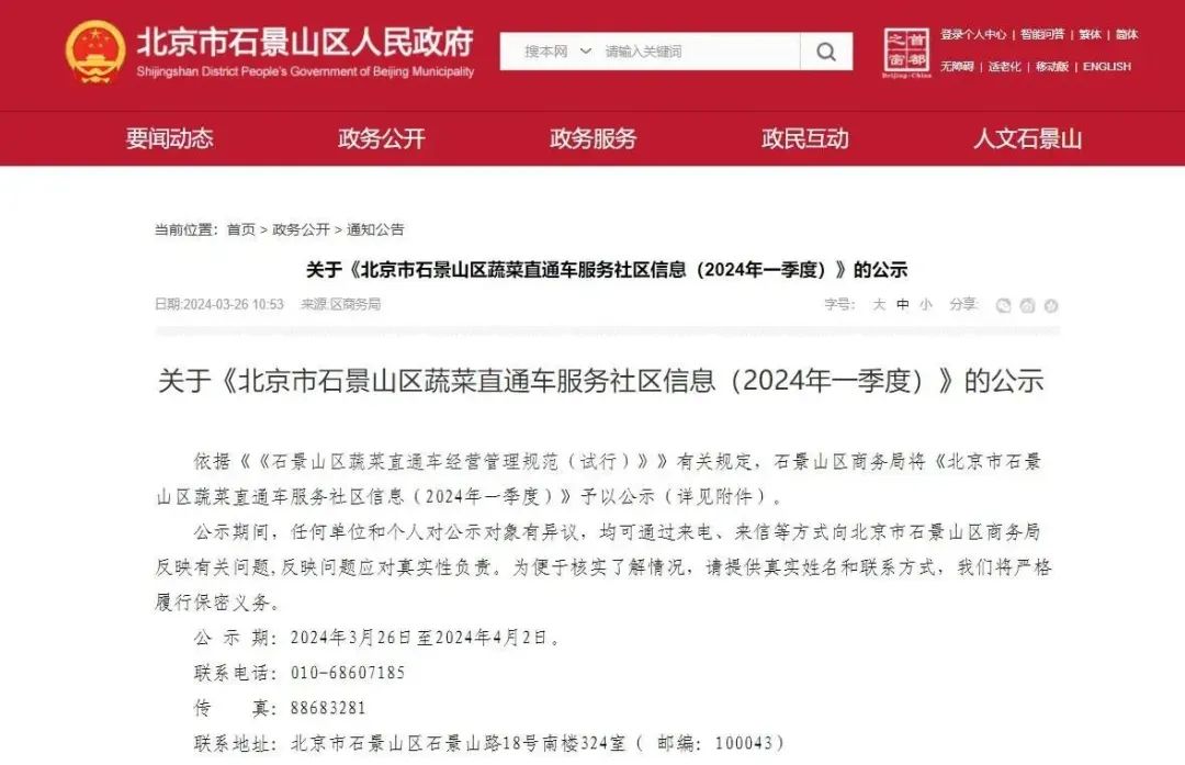 近日,石景山区商务局发布关于《北京市石景山区蔬菜直通车服务社区信息(2024年一季度)》的公示。