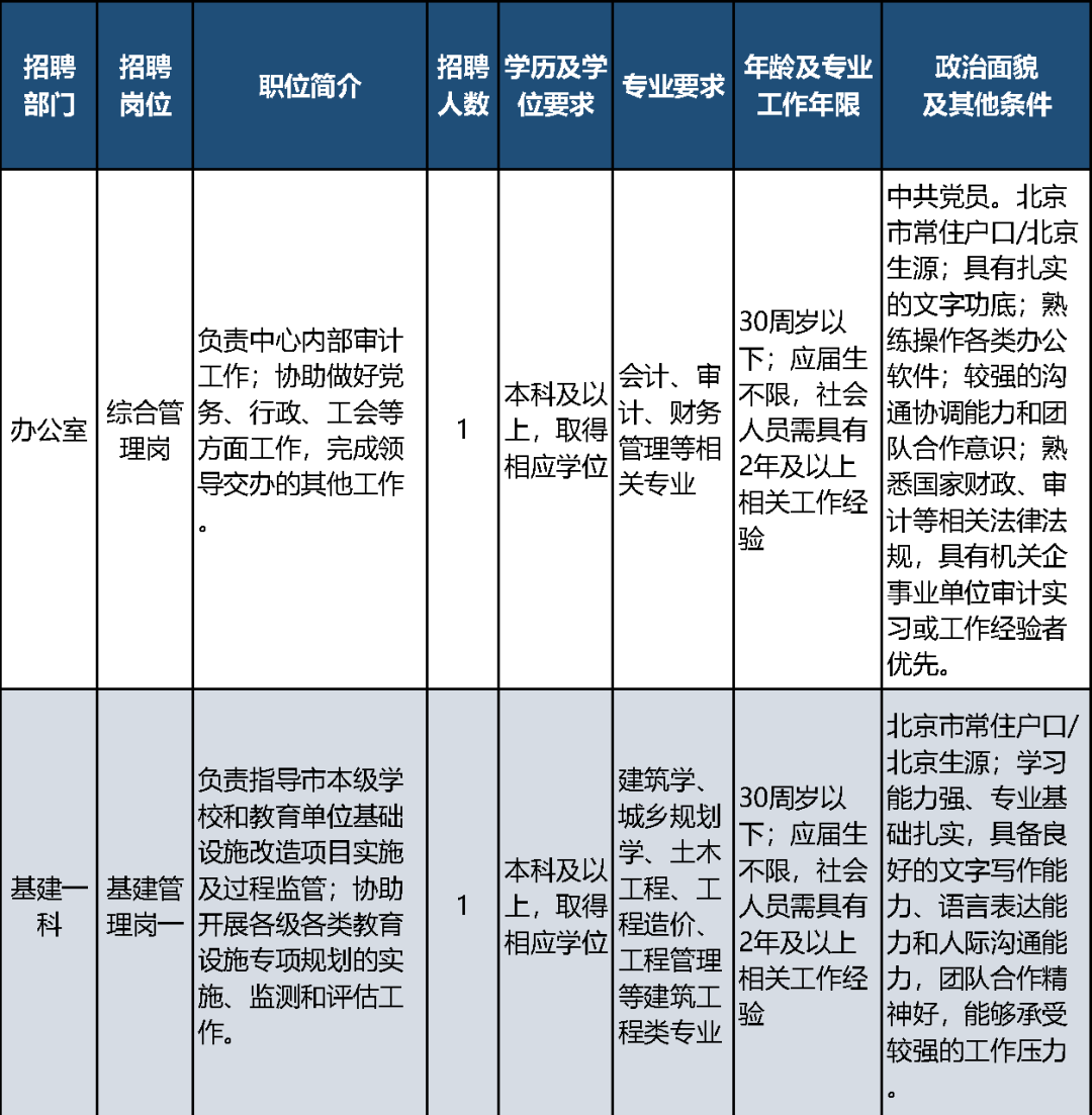 北京市学校基建后勤管理事务中心隶属北京市教育委员会,是公益一类处级事业单位,主要承担本市学校基建管理、后勤管理等事务性工作,现面向社会公开招聘工作人员,一起来看更多详细内容↓↓