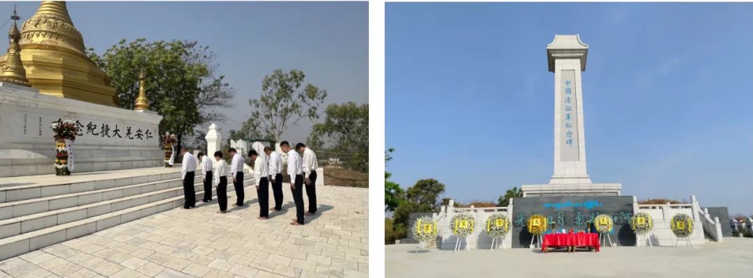 东吁是二战期间中国远征军抗击日本法西斯的会战史迹地。陈海大使等向远征军纪念碑敬献花篮。全体人员默哀追思。