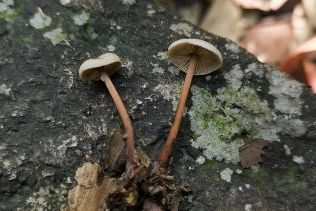 双色裸柄伞菌盖直径约1.2-2厘米,菌盖的中心呈淡褐色,边缘呈米白色,看起来像是被水浸湿的样子。双色裸柄伞的菌肉很薄,菌柄呈圆柱形、红褐色,长度大约在2.5-4厘米之间。这种蘑菇可以在印度尼西亚巴厘岛、中国杭州等地找到,通常在阔叶林地上单独生长。