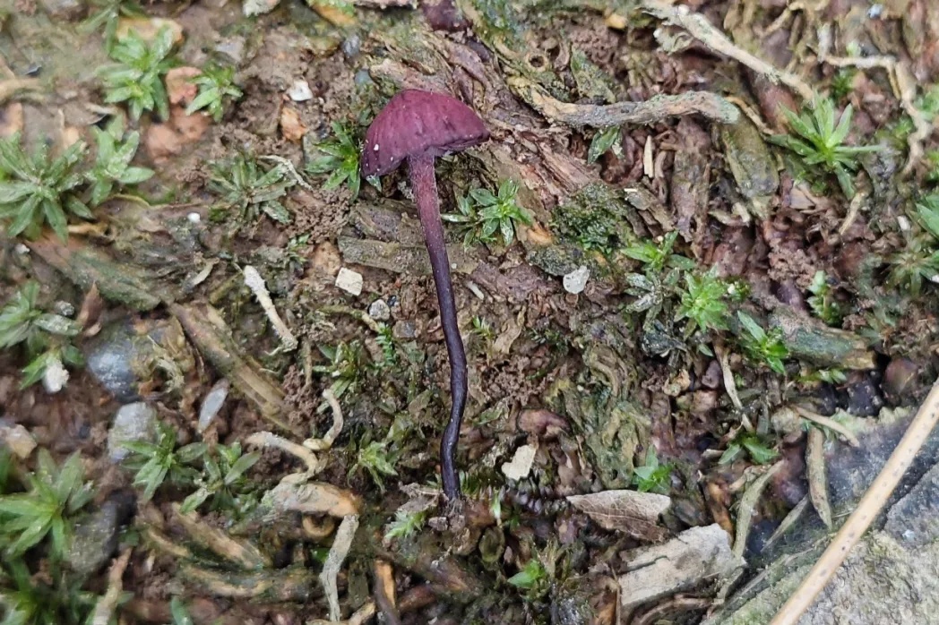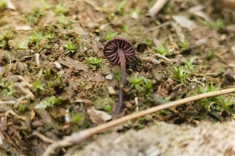 夏威夷假小孢伞菌菌盖直径在5-28毫米之间,形状像一个半球,表面有些凹凸不平,颜色呈暗紫红色。这种蘑菇菌肉颜色为浅紫色,质地柔软。菌柄长度在2-4厘米之间,上半部分紫红色,下半部分紫黑色,表面覆盖有白色的绒毛。在美国夏威夷、中国杭州等地能找到这种蘑菇,它们通常单独生长在竹林的地面上或热带森林中。