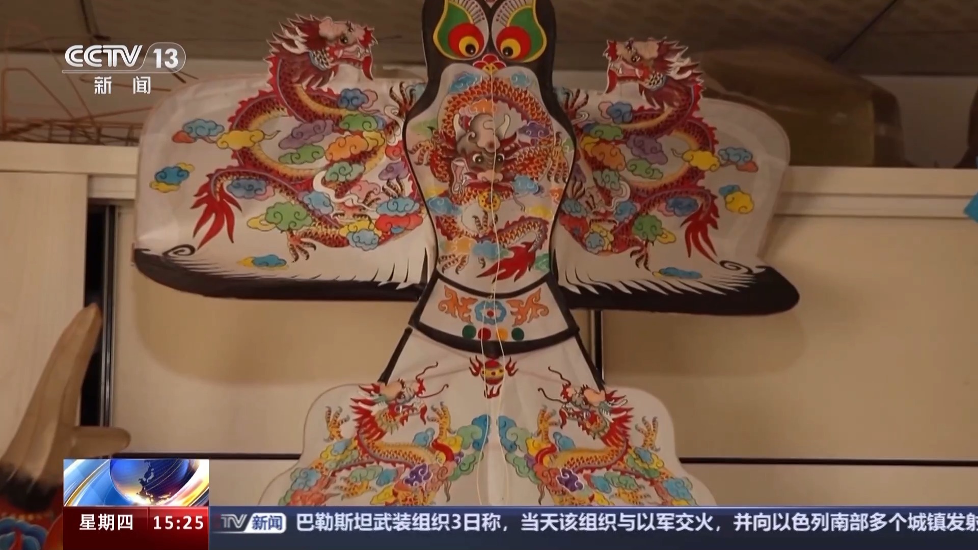 国家级非遗传承人、风筝匠人 张效东:沙燕儿我就说是春天来临的信息,所以我就用燕子做它的整体,五龙就是代表着各民族团结在一个大家庭之中,各行各业龙腾虎跃。