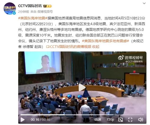 地震发生时,纽约联合国总部正在就巴以问题举行安理会会议,镜头记录下了地震发生时的情形。