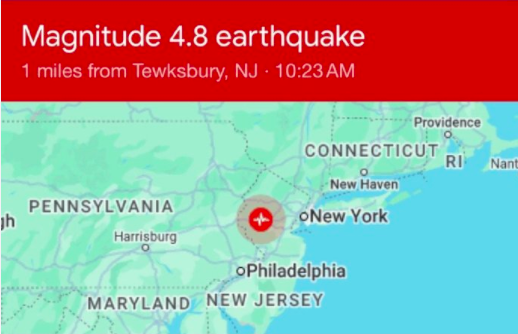 稍早前,据环球网援引《纽约邮报》报道,当地时间5日上午,一场罕见的地震“震动”了纽约地区。美国地质调查局称,当地时间上午10:23左右,新泽西州Lebanon附近发生4.7级地震。
