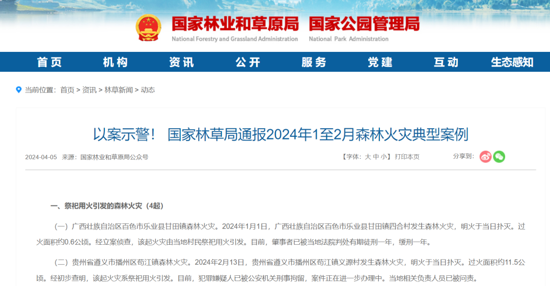 4月5日,国家林业和草原局通报2024年1至2月共25起森林火灾典型案例,包括祭祀用火引发、农事用火引发、电力故障引发、燃放烟花爆竹引发、野外吸烟引发、违规施工作业引发、非法狩猎引发、外火烧入引发等8类案例,具体如下: