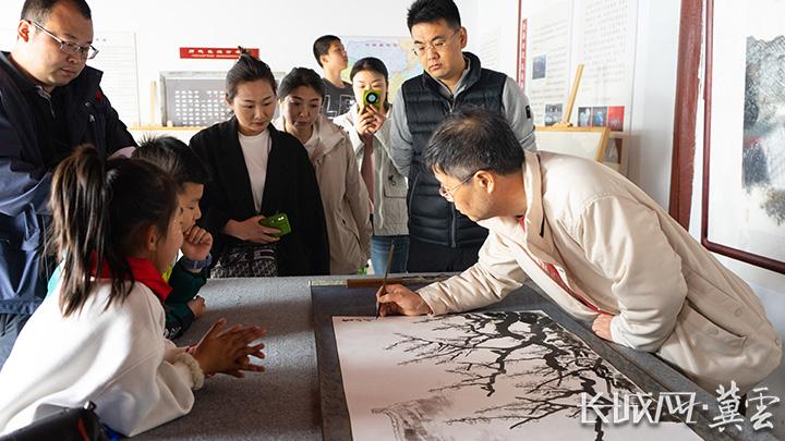 河北省滦平县金山岭长城杏花活动,画家吴建潮在创作金山岭长城杏花相关国画。中共滦平县委宣传部供图