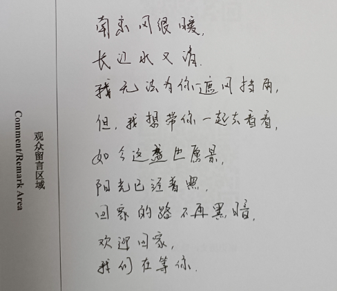 “南京风很暖,长江水又清。我无法为你遮风挡雨,但,我想带你一起去看看……” 这是我们在巡馆期间发现的一条动人留言,来自一名叫郭瑶瑶的00后观众。