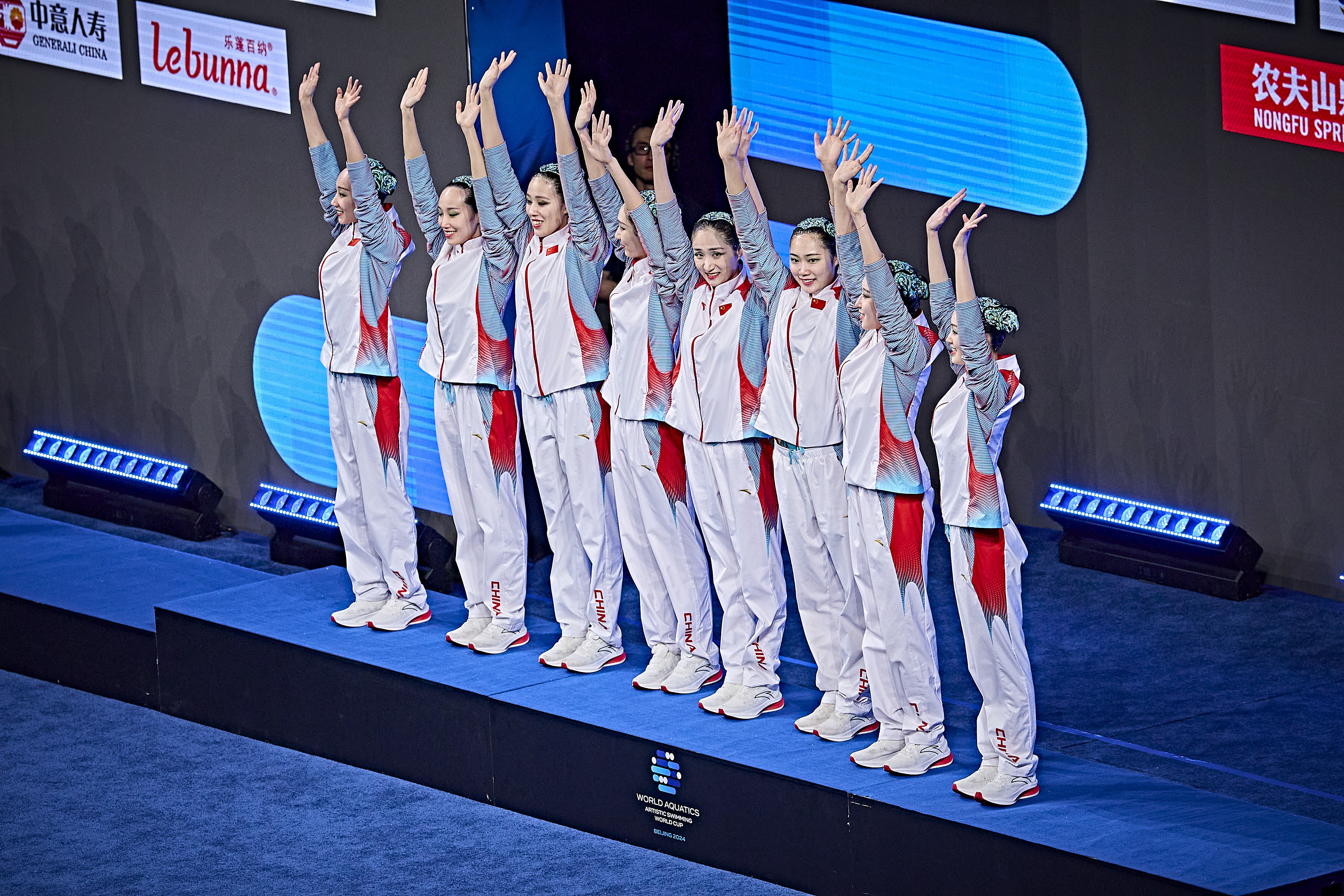 4月6日,2024年世界泳联花样游泳世界杯北京站比赛在国家游泳中心“水立方”继续进行。在刚刚结束的集体自由自选比赛中,中国队夺得冠军。