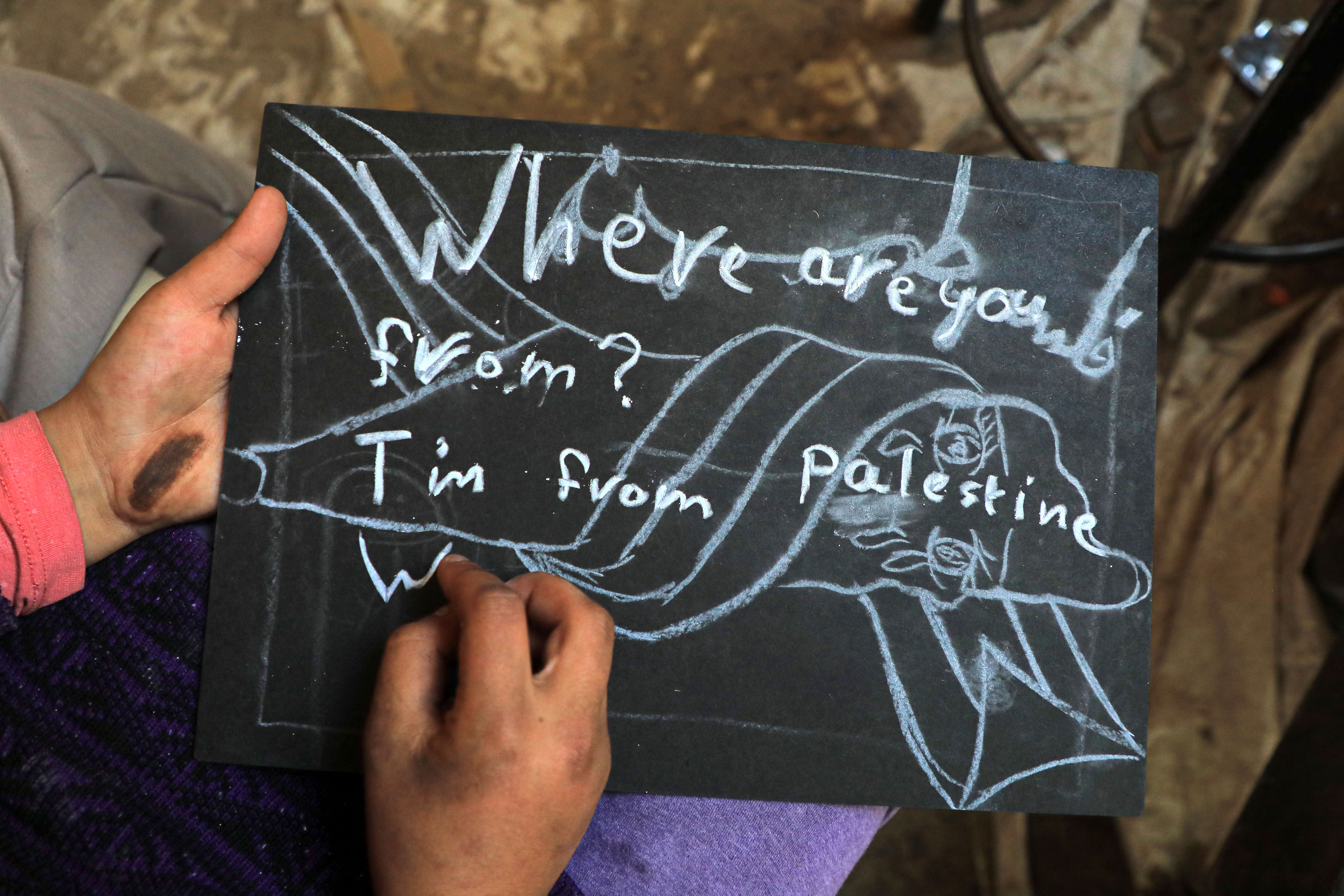 2023年12月28日,一名学生在加沙地带南部城市拉法一所学校的临时教室中写下“我来自巴勒斯坦”的字样。新华社发(里泽克·阿卜杜勒贾瓦德摄)