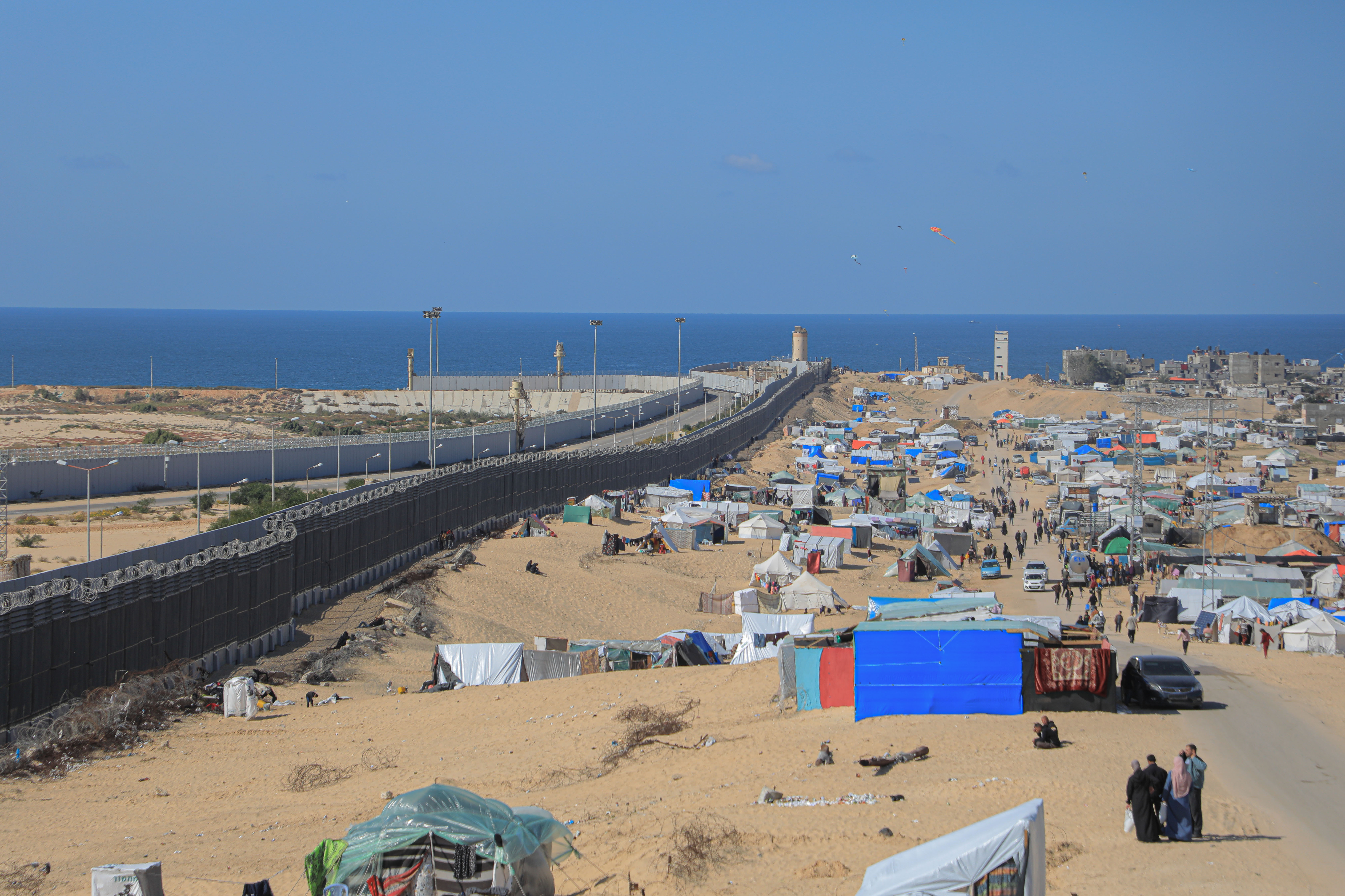 在加沙地带南部与埃及交界的拉法,一堵数米高的隔离墙下,每天都有巴勒斯坦孩子在玩耍,天真的笑声让人短暂忘却战火带来的苦痛。距隔离墙不远的空地上,流离失所的巴勒斯坦人搭建了上千顶帐篷,这里是他们所能逃到的最远的避难地。