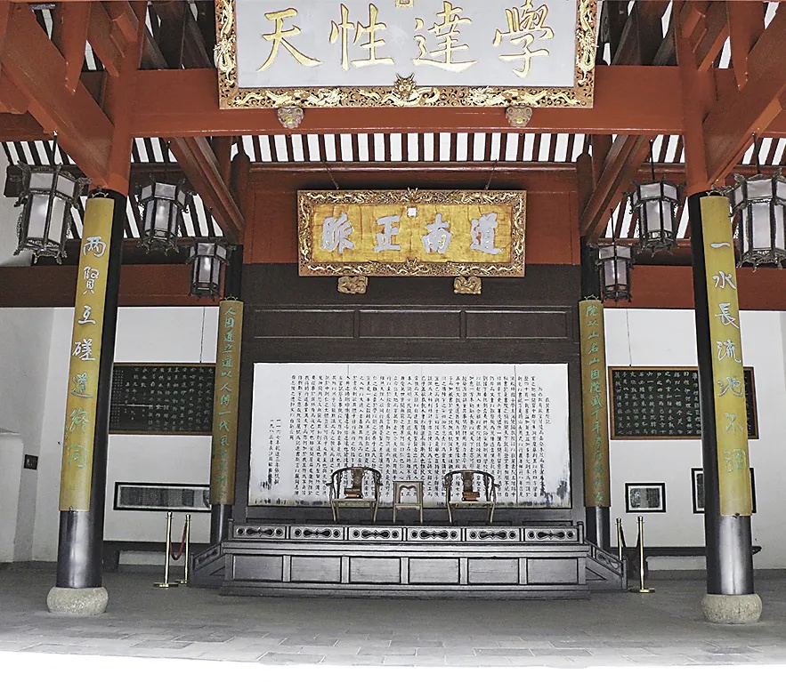 步入讲堂,正中摆放的两把古雅交椅,为纪念南宋理学大师朱熹和张栻而设,“朱张会讲”的盛景让人怀想。后方的木质屏风,刻有张栻撰写的《岳麓书院记》。