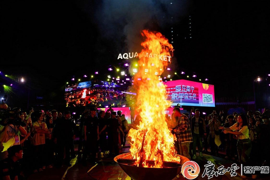 爱火点燃,“红男绿女”围着篝火载歌载舞。南宁市委宣传部 供图