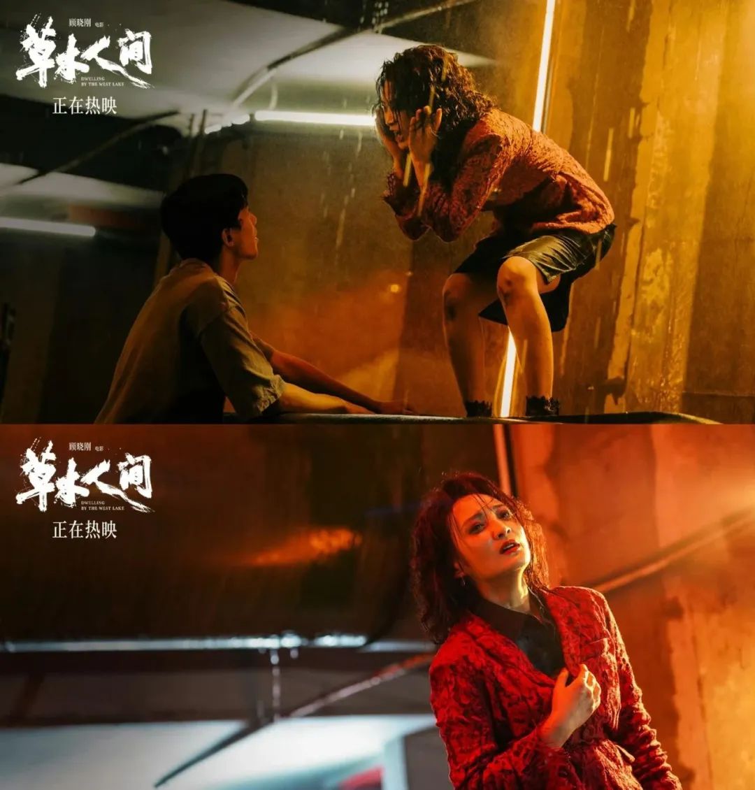 在《草木人间》进行到一大半时,片中已经在传销邪路上走火入魔的吴苔花,完全进入了癫狂状态,她穿着红色皱巴的上衣,一头凌乱的头发被雨水打湿,嘴角被擦掉的口红就像是一道血色刀疤,浓浓的眼影下眼睫毛已经脱落,她垂下手,身体往后倾斜,仰头发出了嘶吼的呐喊……