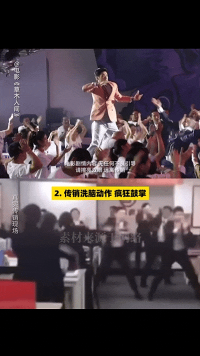 《草木人间》的开头和结尾部分充满了诗意和禅意,但中间部分却用了非常写实的手法,将吴苔花逐渐被传销组织“蝴蝶国际”洗脑并最终走向疯魔的过程拍得丝丝入扣。正如很多观众在网上找到的传销组织的内部培训视频,《草木人间》将这些画面进行了艺术再现,可能有的观众会觉得这些传销手法有点老套,但艺绽君并不认可,因为它还是抓住了这些被洗脑人群的主要心理特征,那就是希望能够出人头地,成为“独立自信”的人上人。