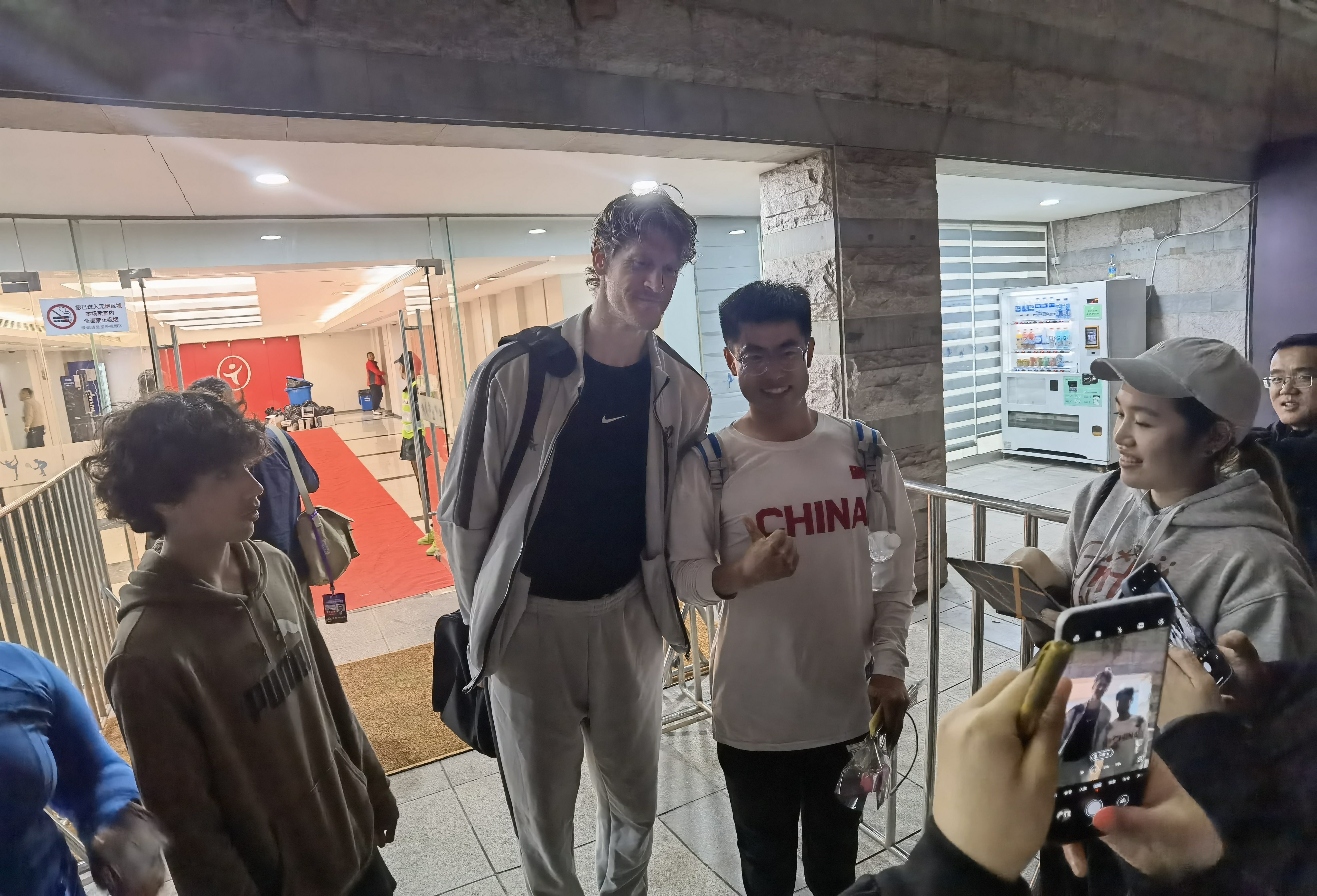 房间内的气氛有些凝重,直到霍尔特的到来才被打破。由于房间层高的原因,他稍低着头走进来,脸上带着笑意,眼神环顾四周,照顾到在场所有人,大家也点头或微笑,此时屋内的气氛活跃了一些。作为队内大赛经验最多的球员,霍尔特时常展现出他从容的一面。