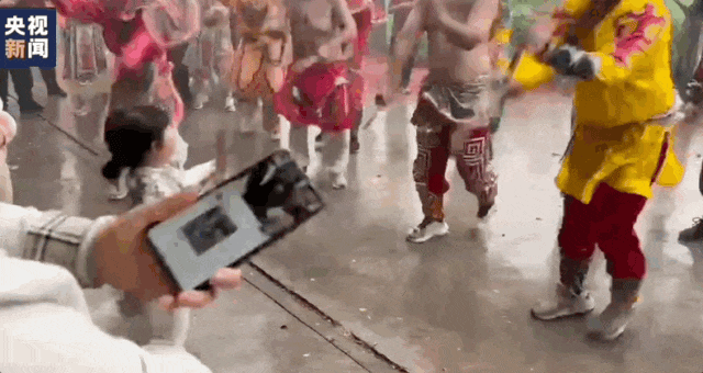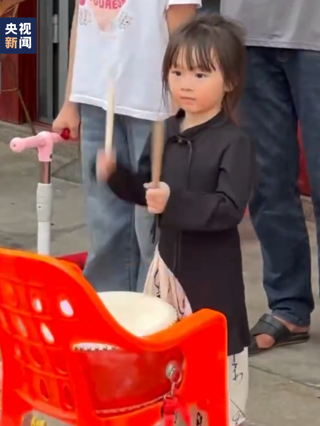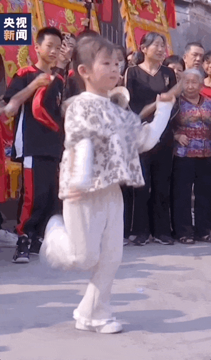 一位小女孩遇上当地英歌队巡游表演