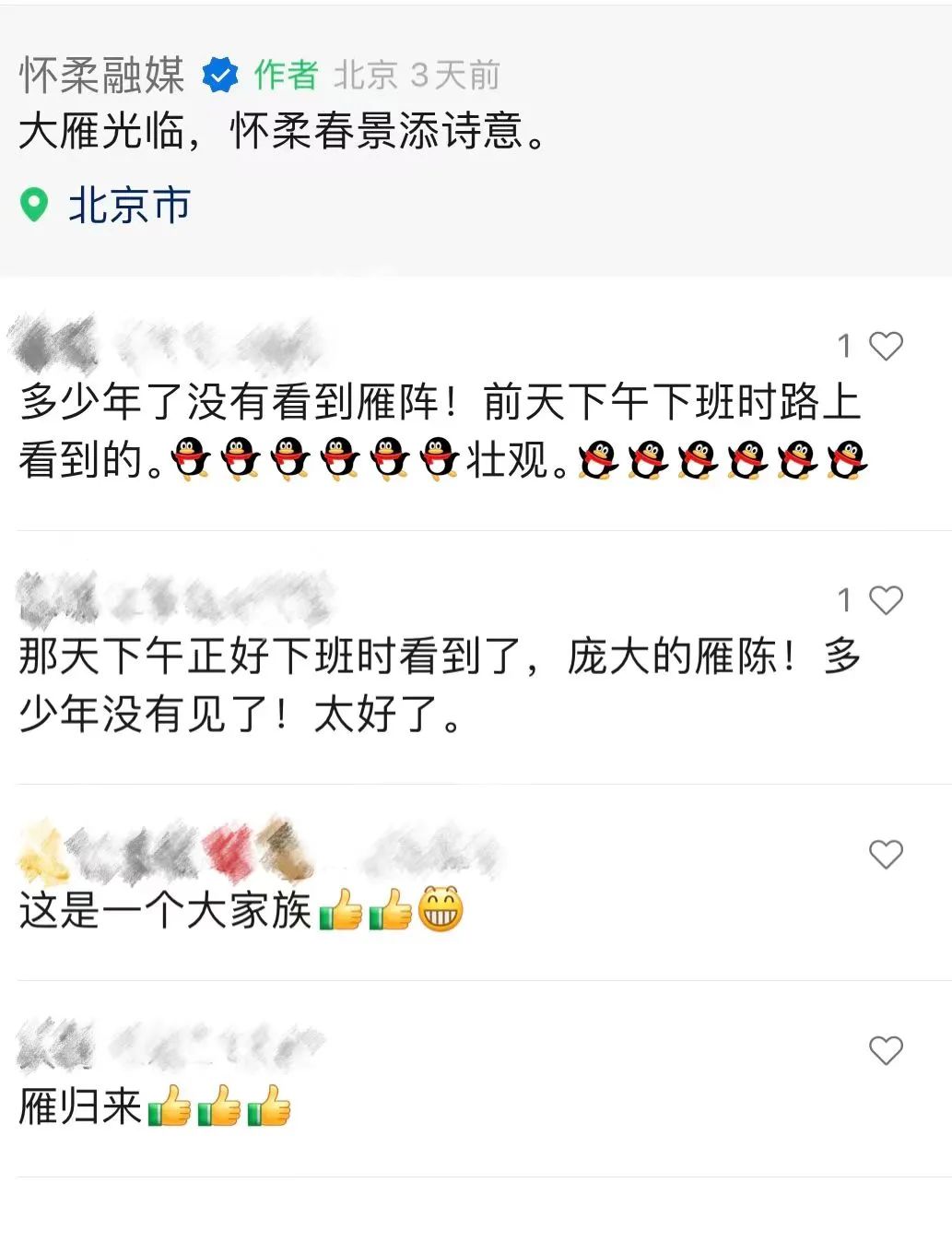 大雁光临的视频一经发布,网友们纷纷热议,更有人感叹:好久没看到这样的雁阵了!