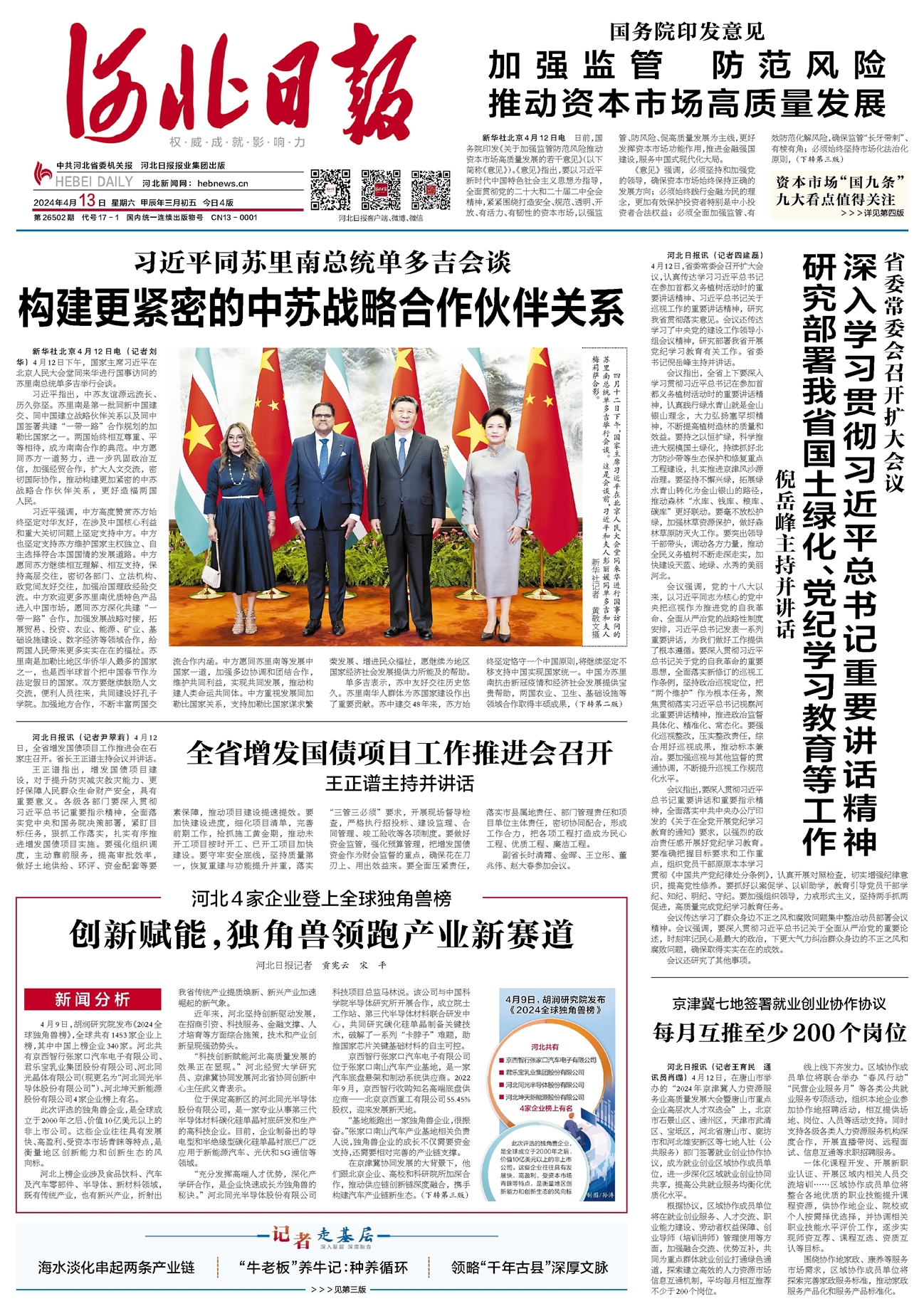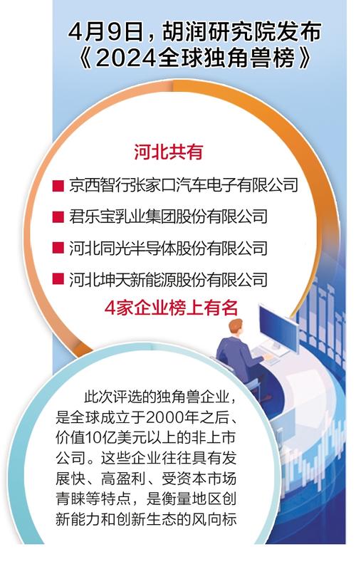 4月9日,胡润研究院发布《2024全球独角兽榜》,全球共有1453家企业上榜,其中中国上榜企业340家。河北共有京西智行张家口汽车电子有限公司、君乐宝乳业集团股份有限公司、河北同光晶体有限公司(现更名为“河北同光半导体股份有限公司”)、河北坤天新能源股份有限公司4家企业榜上有名。详情>>