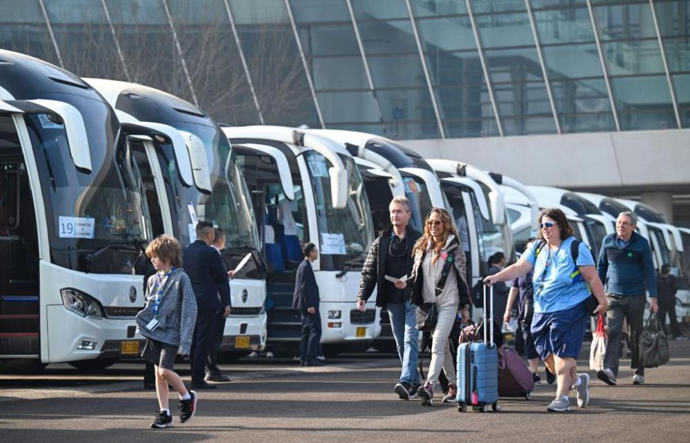 4月7日,外籍旅客准备搭乘大巴车前往京津旅游景点。新华社记者 孙凡越 摄
