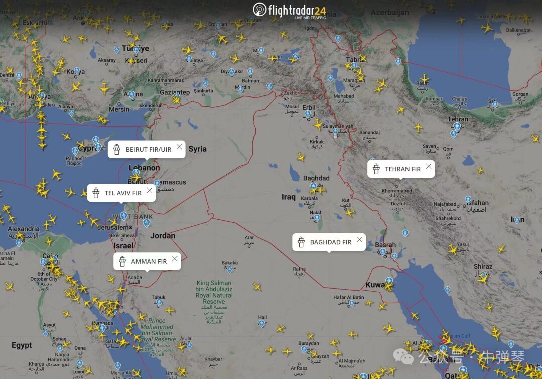 看了一下最新的航运图,伊朗、以色列、叙利亚、伊拉克、约旦等国,领空都全部封闭。