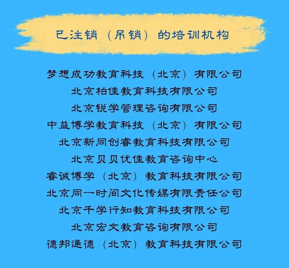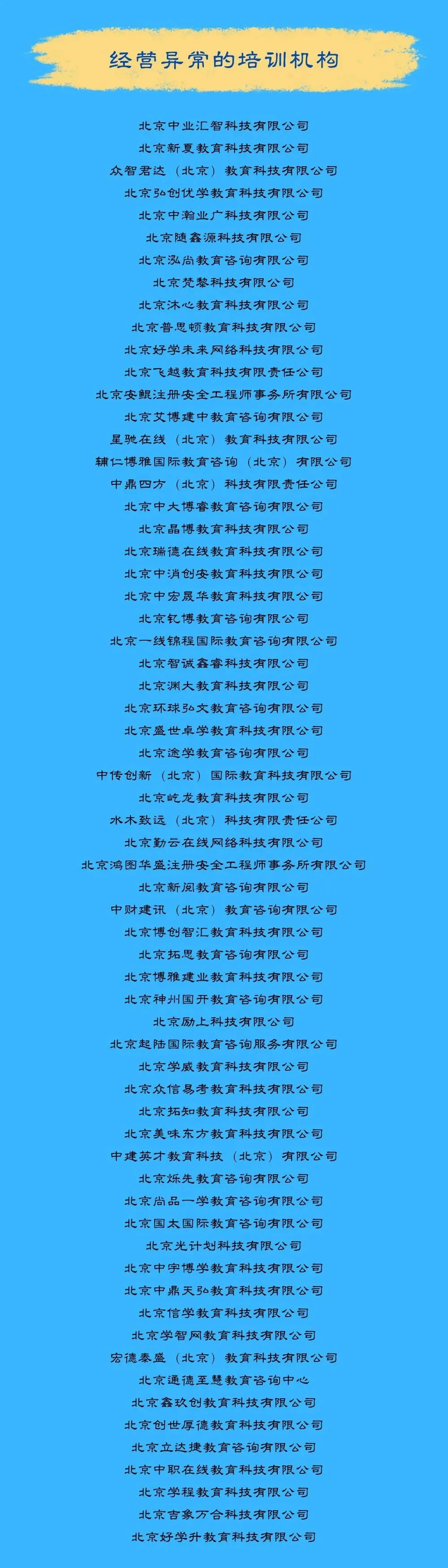 本次发布的警示名单包含“经营异常的培训机构” 64家、“已注销(吊销)的培训机构”11家、“投诉量大且解决率低的培训机构”5家。其中,经营异常的培训机构主要有三种情形:未按照规定履行年度报告公示义务的;未按照规定履行信息公示义务的;通过登记的住所(经营场所)无法联系的。消费者可通过北京市企业信用信息网查询具体情形。