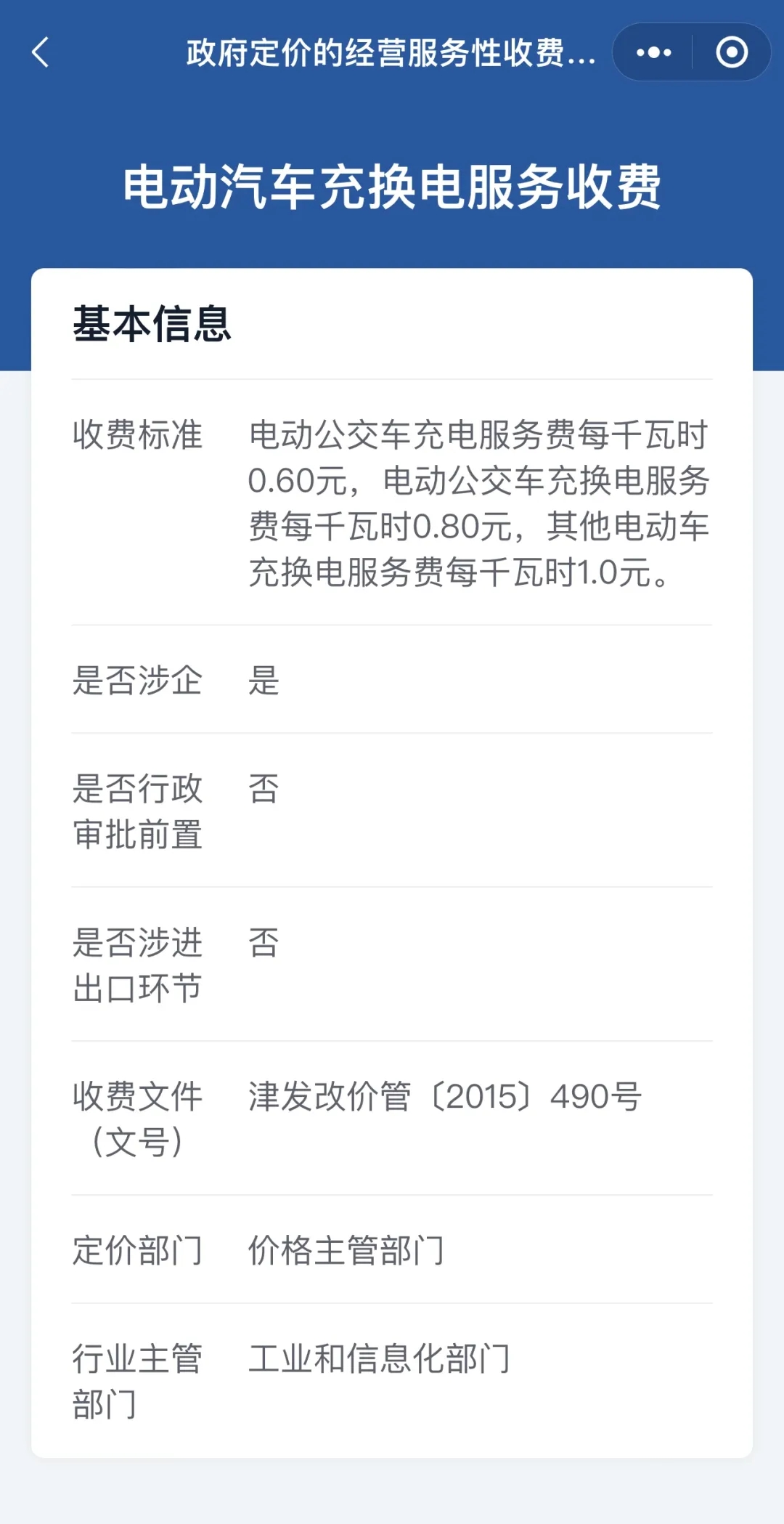 点击定价项目名称,就会看到具体的收费标准、收费文件、定价部门、行业主管部门、是否涉企等多项信息。