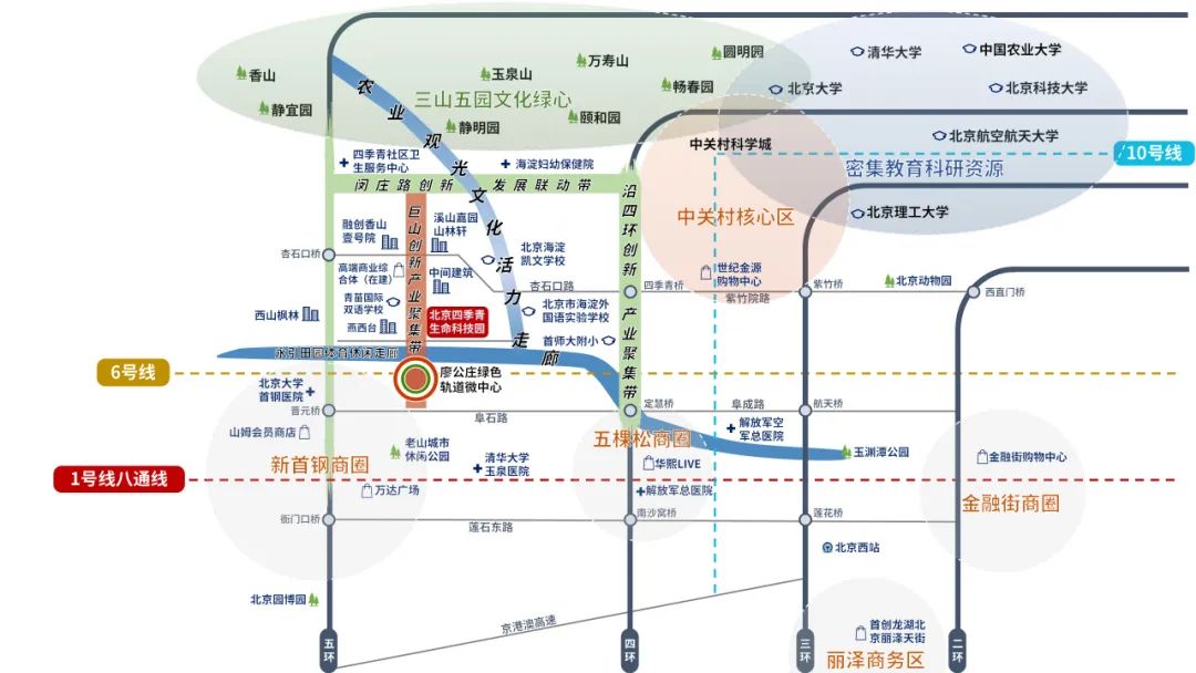 园区地理位置优越,交通路网便捷,距离地铁六号线“廖公庄”站约800米,周边配套完善,尽享高质量的教育、医疗、购物、养老等配套资源。
