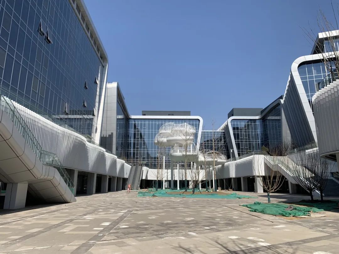 除了连廊和拱门的匠心设计外,据悉,园区的4万平方米的玻璃外幕墙也融入了创新创意。园区全部采用的是深蓝色超白钢化玻璃,取源于“生命源于海洋、生生不息”之意,更为贴近生命健康园区主题。整体建筑的中央是一个下沉广场。据介绍,地下一层下沉广场的主要功能是未来的商业配套,包括食堂、便利店、咖啡厅、健身房等,满足企业员工的日常需求。