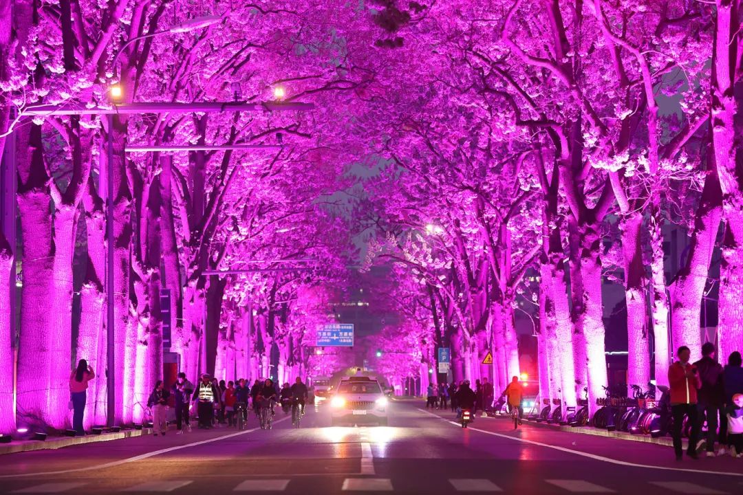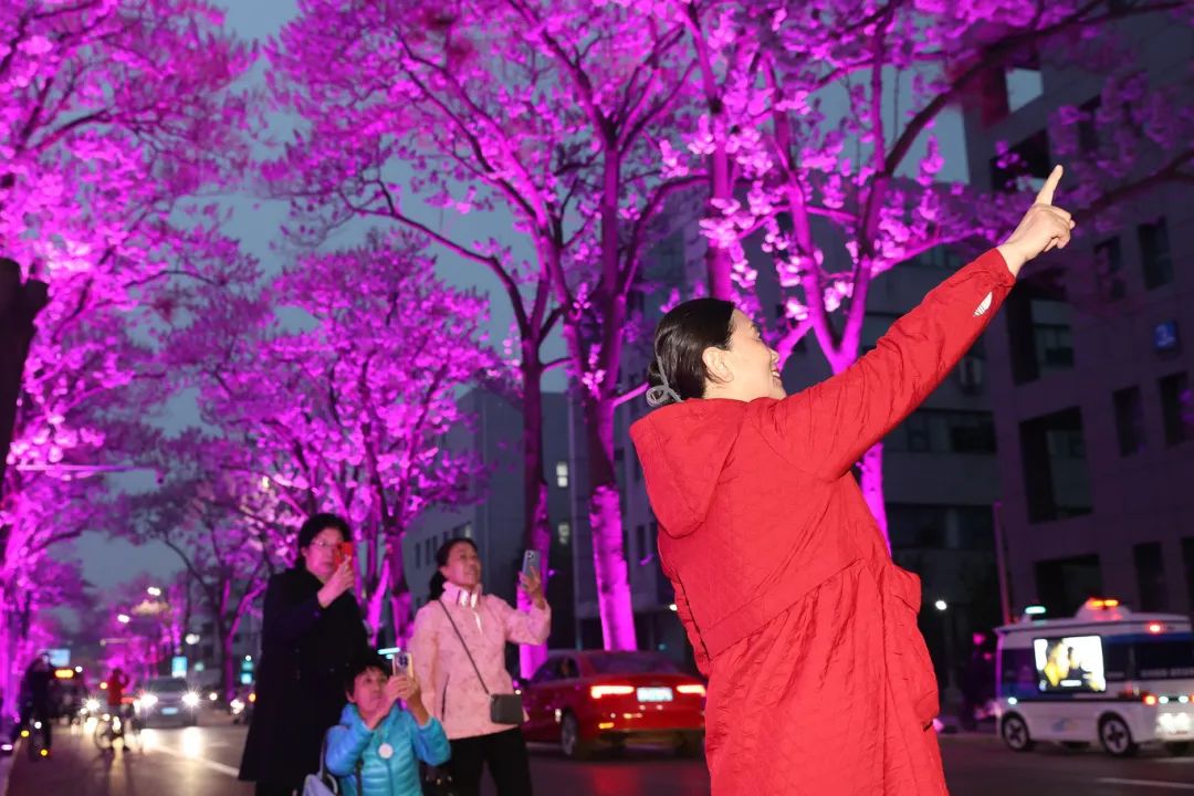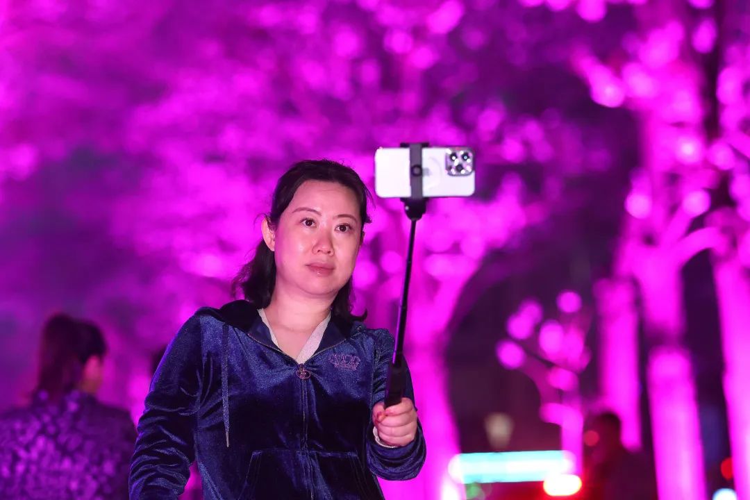 茂盛的树冠上,仿佛托着一空星光。多彩的夜景令人陶醉,参与打卡的市民纷纷驻足,拿出手机、相机定格泡桐大道的美景,或以绚丽的灯光秀为背景拍照留念。