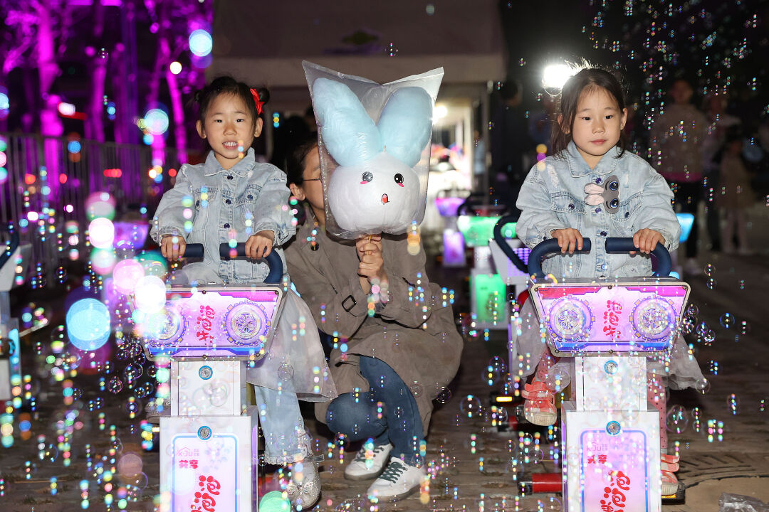 △孩童一边享受夜晚的泡桐大道一边在市集中玩耍。吴江/摄