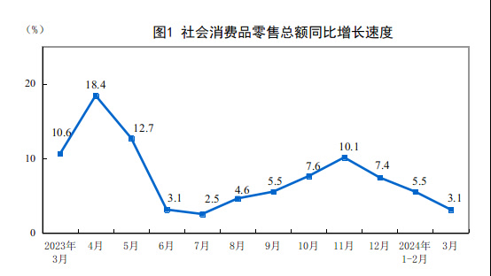 按经营单位所在地分,3月份,城镇消费品零售额33843亿元,同比增长3.0%;乡村消费品零售额5177亿元,增长3.8%。1—3月份,城镇消费品零售额104280亿元,增长4.6%;乡村消费品零售额16047亿元,增长5.2%。