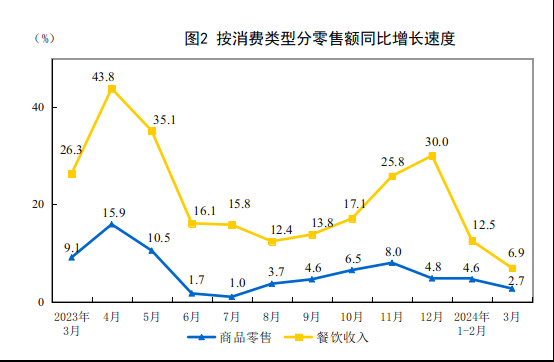 按消费类型分,3月份,商品零售35056亿元,同比增长2.7%;餐饮收入3964亿元,增长6.9%。1—3月份,商品零售106882亿元,增长4.0%;餐饮收入13445亿元,增长10.8%。