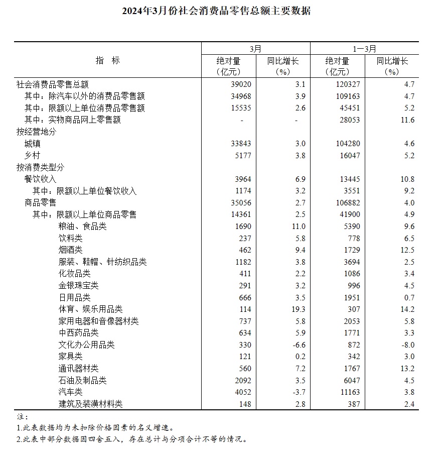 3月份,社会消费品零售总额39020亿元,同比增长3.1%。其中,除汽车以外的消费品零售额34968亿元,增长3.9%。