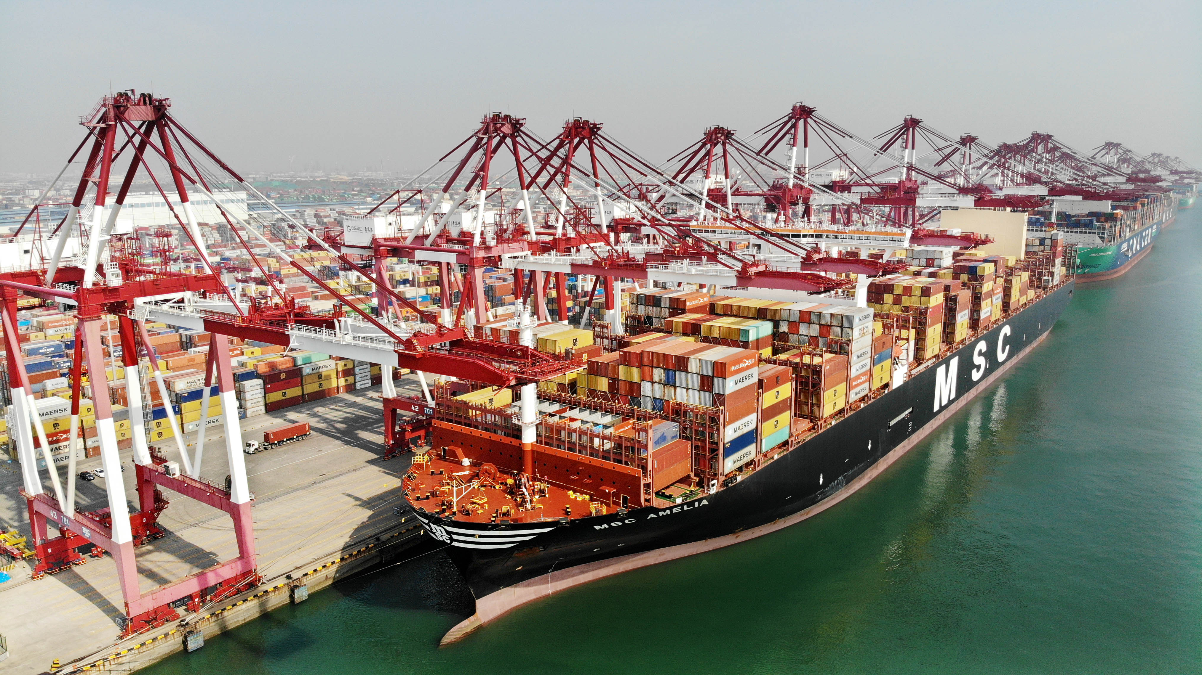 3月13日,货轮在山东港口青岛港装卸集装箱(无人机照片)。新华社记者 李紫恒 摄