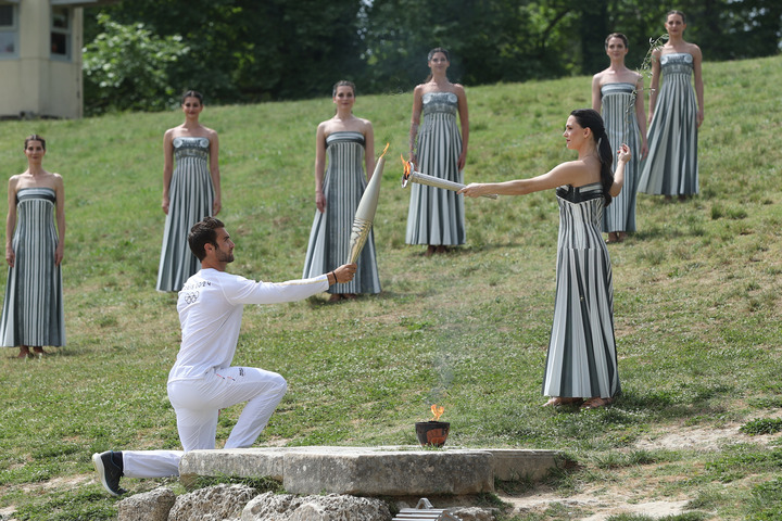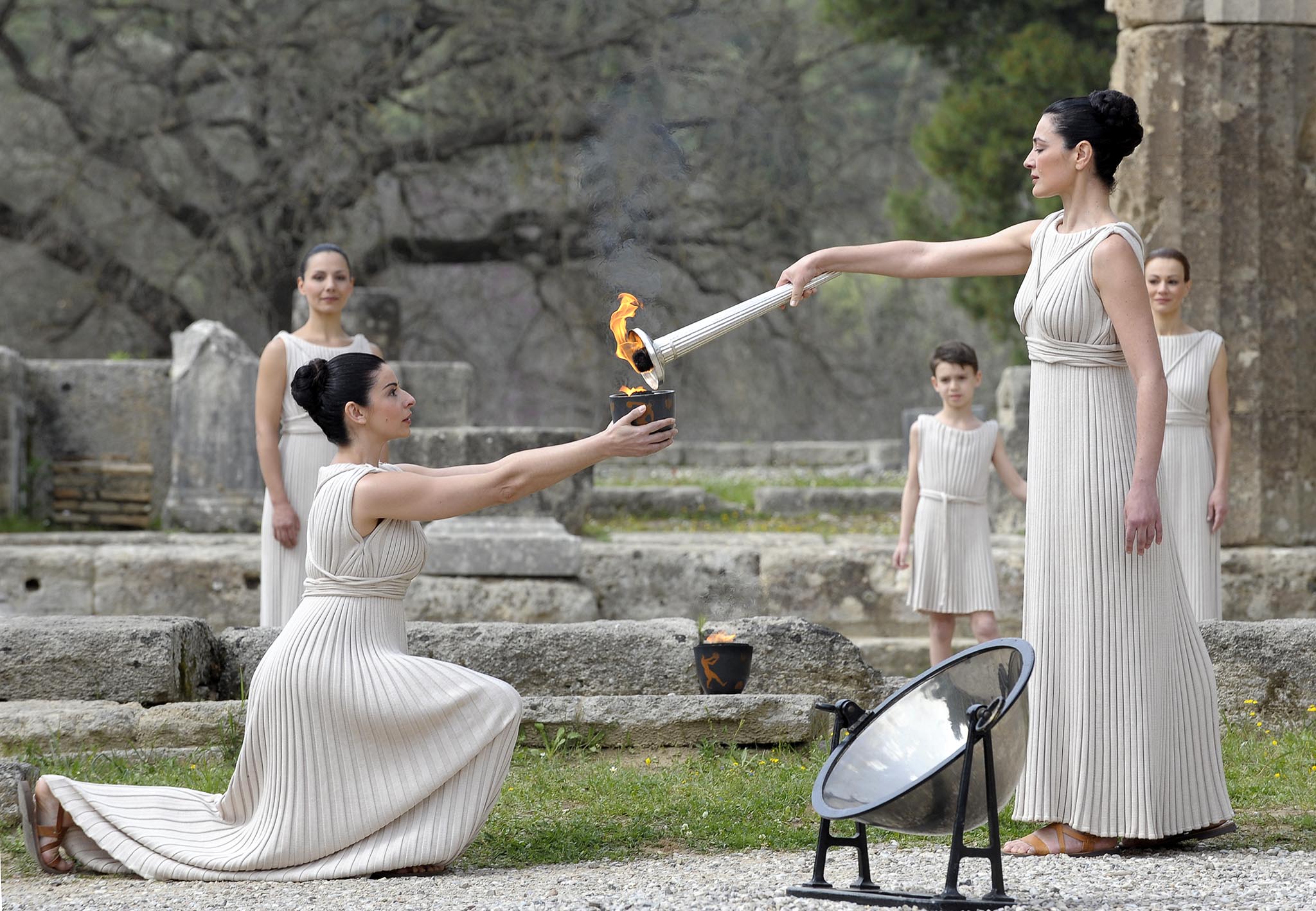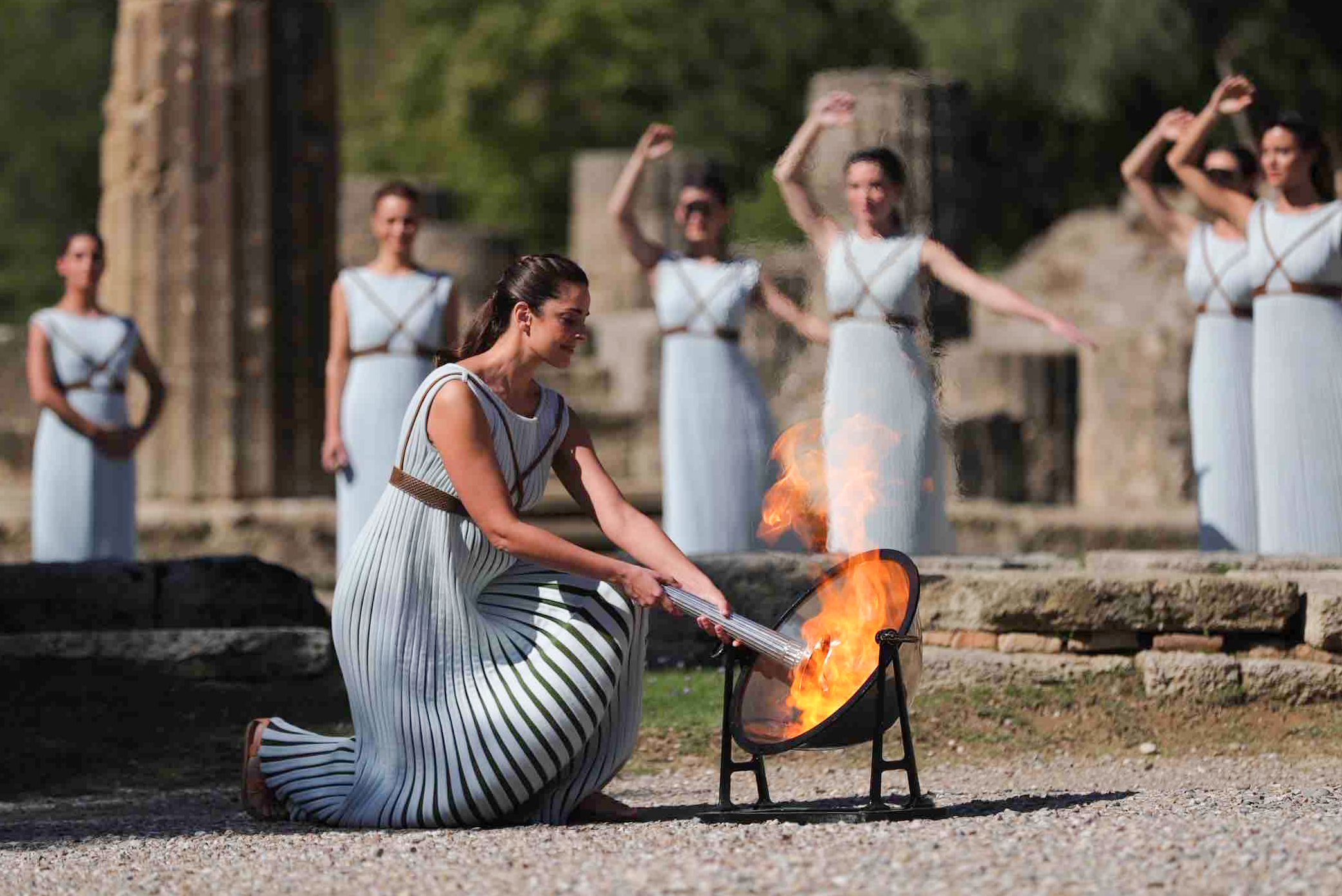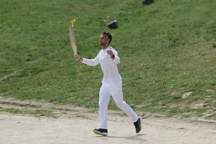 在古奥林匹亚体育场,最高女祭司将火种和象征和平的橄榄枝一同交给第一位火炬手,标志着奥林匹克火炬传递正式开启。