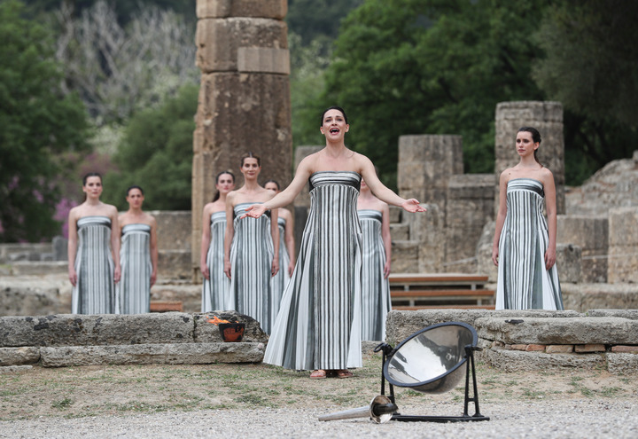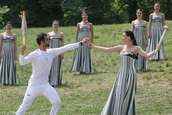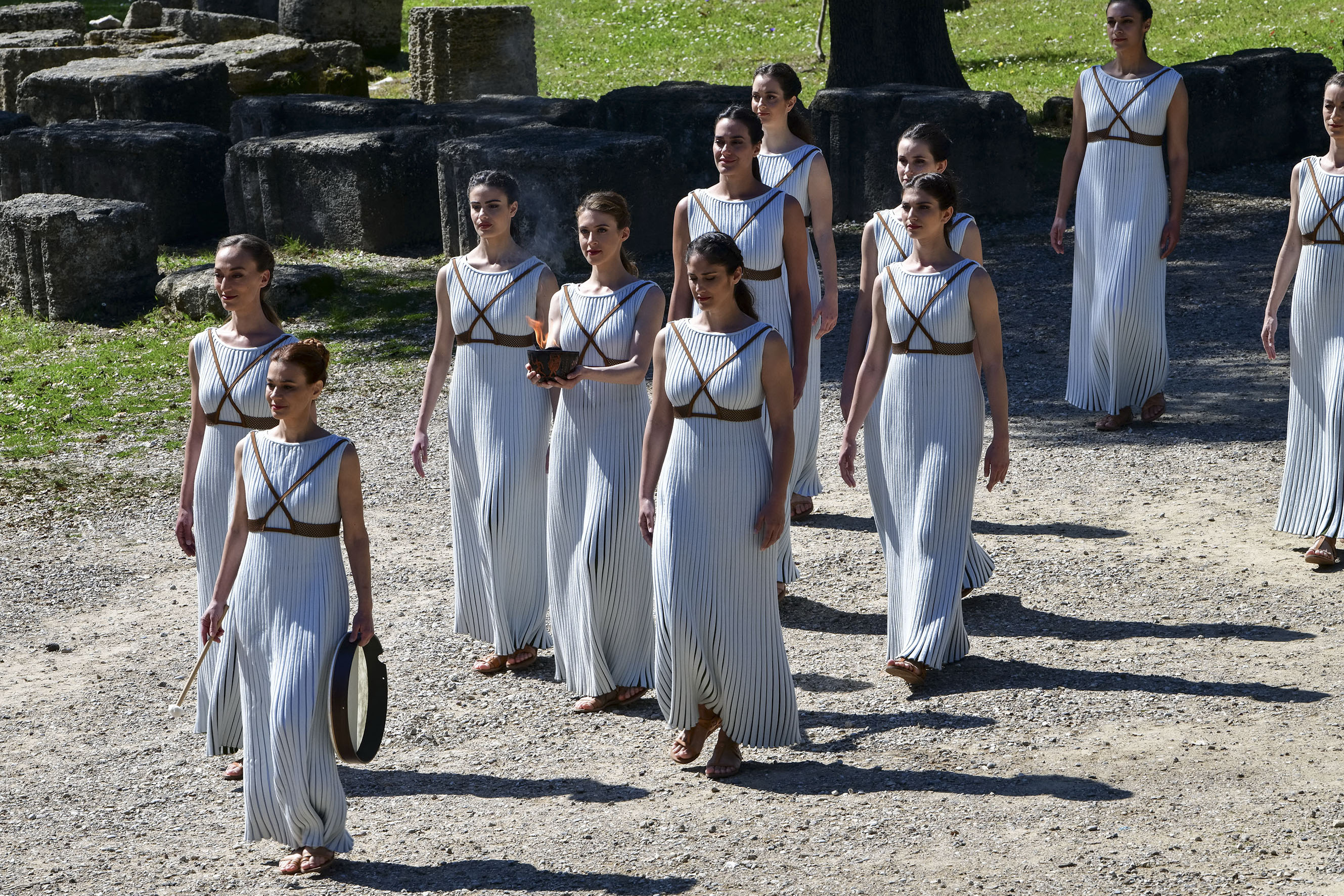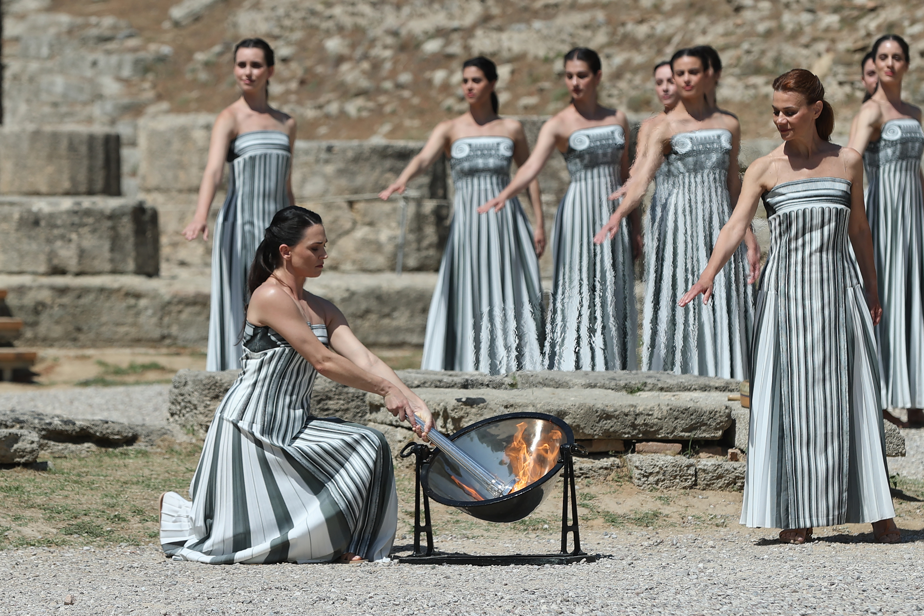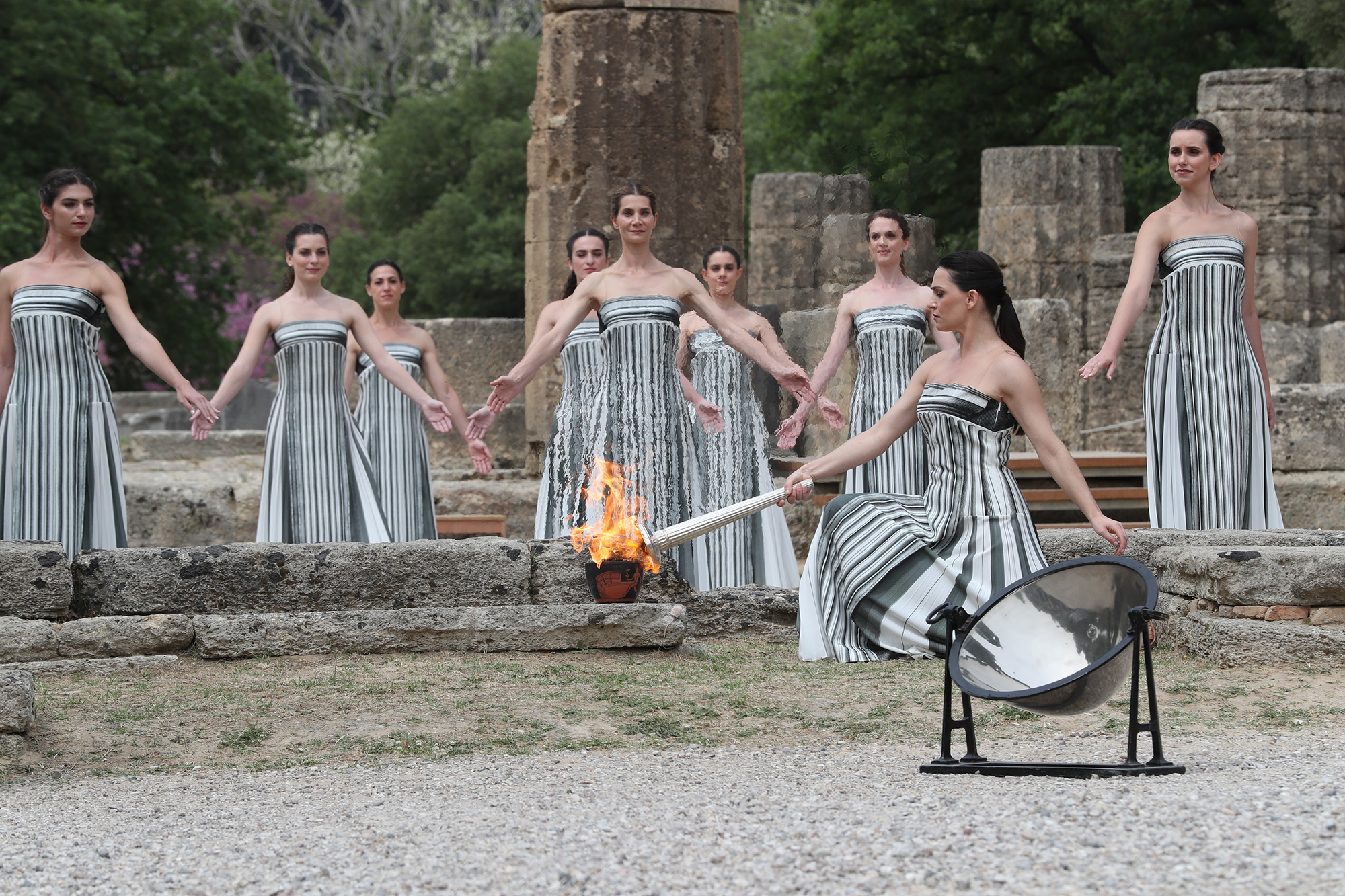 在古奥林匹亚体育场,最高女祭司将火种和象征和平的橄榄枝一同交给第一位火炬手,标志着奥林匹克火炬传递正式开启。