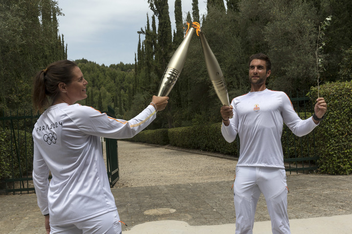 ⬆️2024年4月16日,在巴黎奥运会圣火火种采集仪式上,扮演最高女祭司的演员玛丽·米娜(前右)点燃第一棒火炬手——希腊运动员、东京奥运会男子赛艇项目金牌得主斯特凡诺斯·恩图斯科斯手中的火炬。新华社记者 赵丁喆 摄