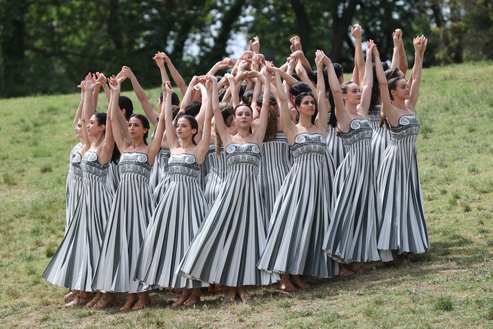 ⬆️2020年3月12日,在东京奥运会火种采集仪式上,扮演女祭司的演员们护送点燃的火种罐。新华社发(安东尼斯·尼科洛普洛斯摄)