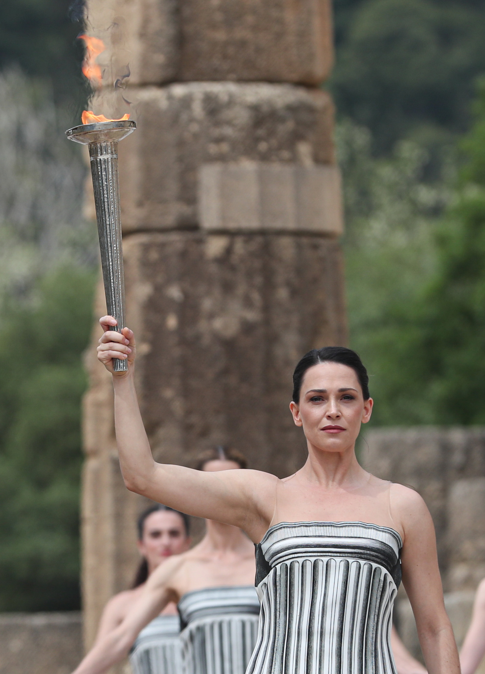 ⬆️2024年4月16日,在巴黎奥运会圣火火种采集仪式上,扮演最高女祭司的演员玛丽·米娜展示火炬。新华社记者 李京 摄