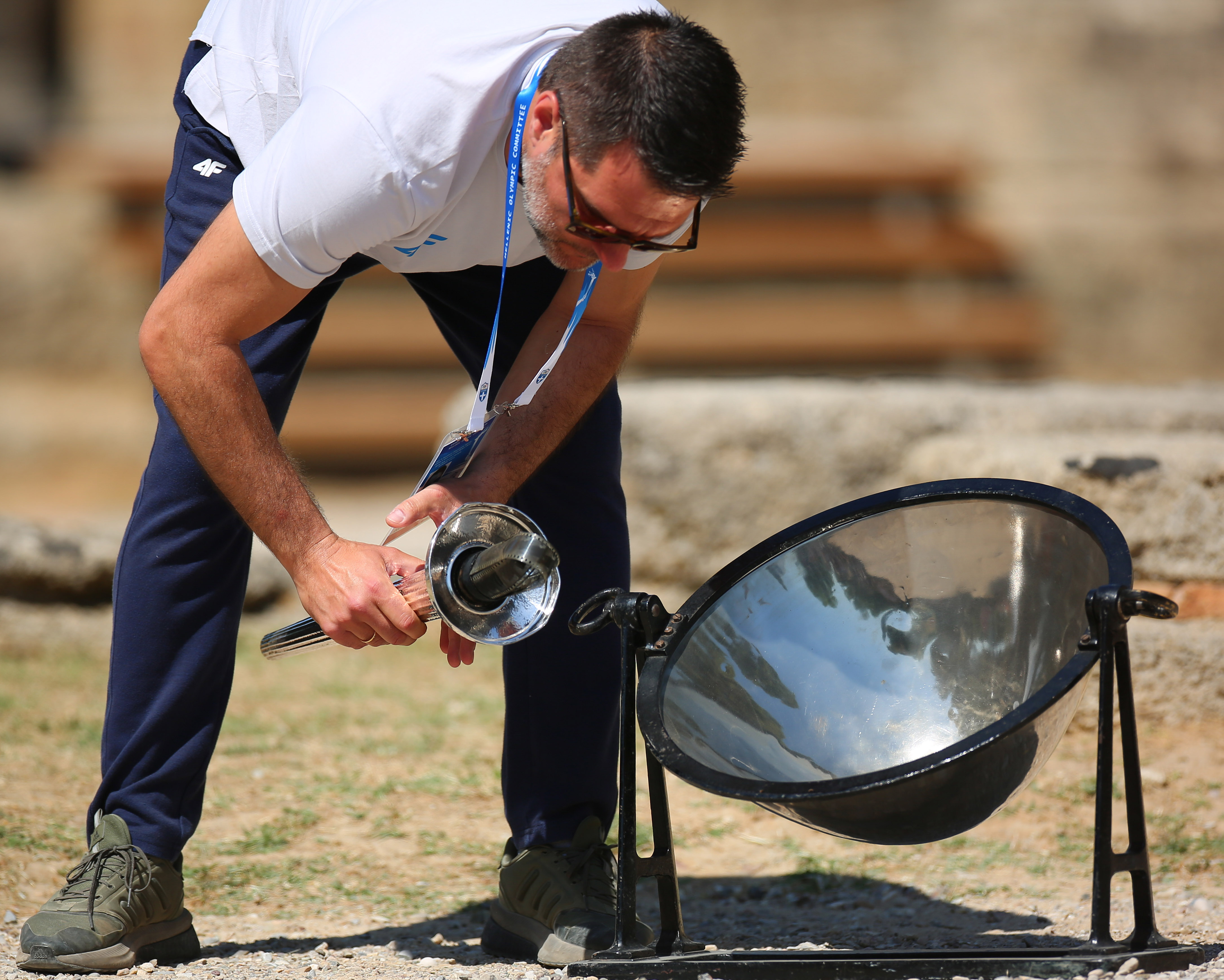 不同于人工手段点火,为了彰显圣火的纯净,火种采集自太阳光。采集过程非常简单,用凹面镜汇聚太阳光点燃在采集火炬上的胶片。