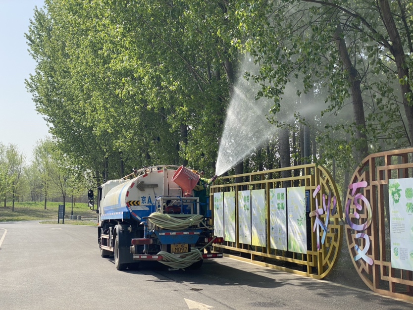在飞絮高发期,首发生态公司使用高压水车、喷雾车等专业车辆对杨柳树树冠喷水,将飞絮喷湿落地,使其不能在空中扩散,达到控制飞絮的目的。“我们也会在早上和傍晚对公园地面进行洒水喷湿,防止地面的杨柳絮再次飞起,飞絮高发期,湿化次数达到每天四次。”李号说。