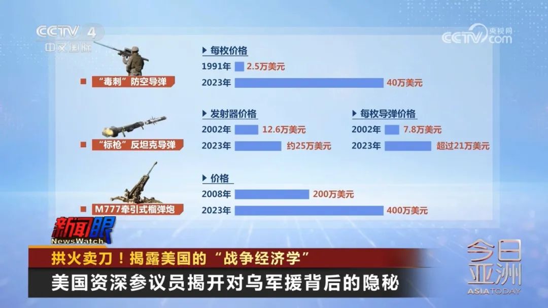 统计显示,截至2023年12月,美国向乌克兰提供了2000套“毒刺”防空导弹,每枚价格从1991年的2.5万美元增加到2023年的40万美元,涨了16倍,而这只是冰山一角。