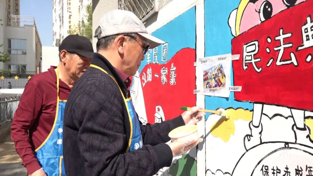 这面手绘涂鸦墙共绘有军民团结、普法宣传、童心向党、垃圾分类等7组主题墙画,绘制内容均由社区居民自己创作。