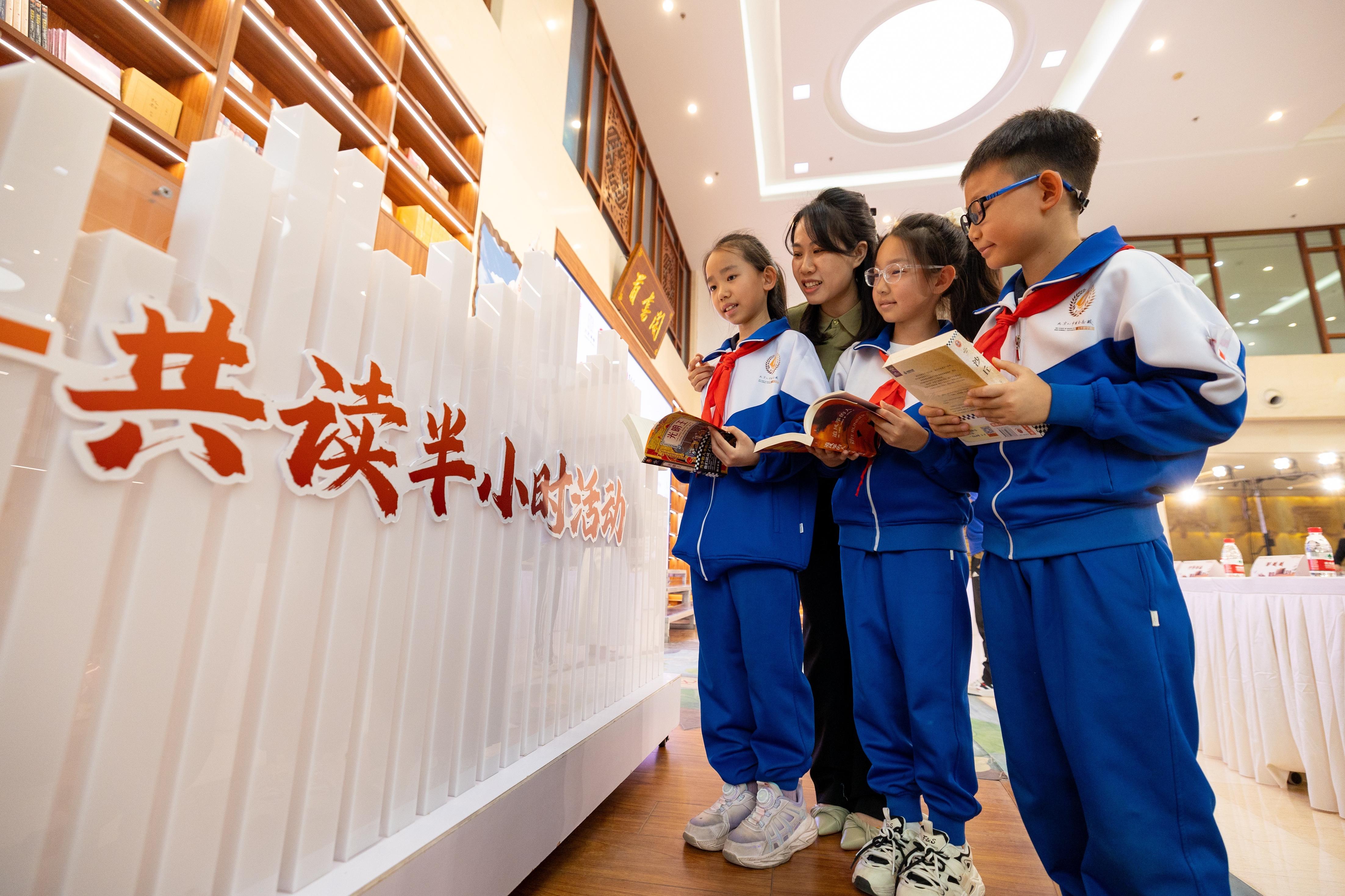 活动主会场,太平桥学校的孩子们朗诵的《为中华之崛起而读书》赢得了阵阵掌声,天籁童声遇见经典语录,让孩子们在诵读中重温民族精神,树立宏伟志向,以经典润泽心灵。“我最近正在读《西游记》,读书学到的知识和课堂上老师所讲的不一样,能丰富我的文化和生活,对语文学习也很有帮助。”太平桥小学四年级三班的朱梓让小朋友告诉记者,“今天发起的每天读书半小时活动很有意义,希望把读书作为我的习惯一直延续下去,就像今天我们朗诵表演时说的那样:为中华之崛起而读书。”