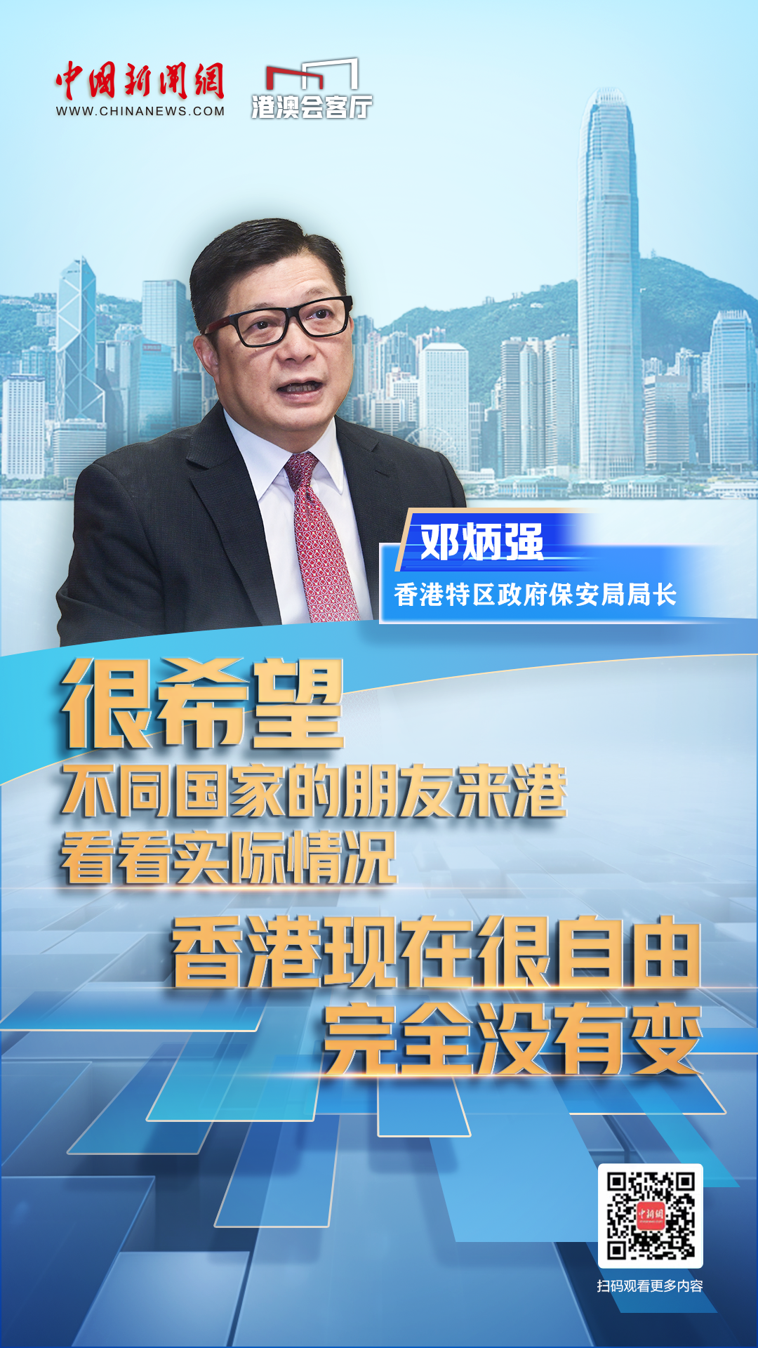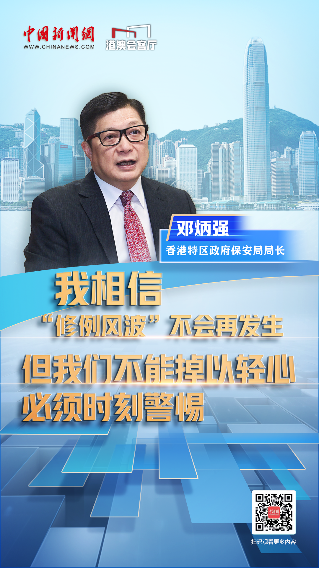 邓炳强:其实我们是得了几个教训的。我们香港市民的国家安全意识,对国家风险的意识是不够的。正如我所说,2019年之前,没有人相信香港是有国家安全风险的,就是意识不够。当年没有足够的法律工具,现在我们有(香港)国安法,有《维护国家安全条例》,所以我相信,将来我们的安全是得到保障的。