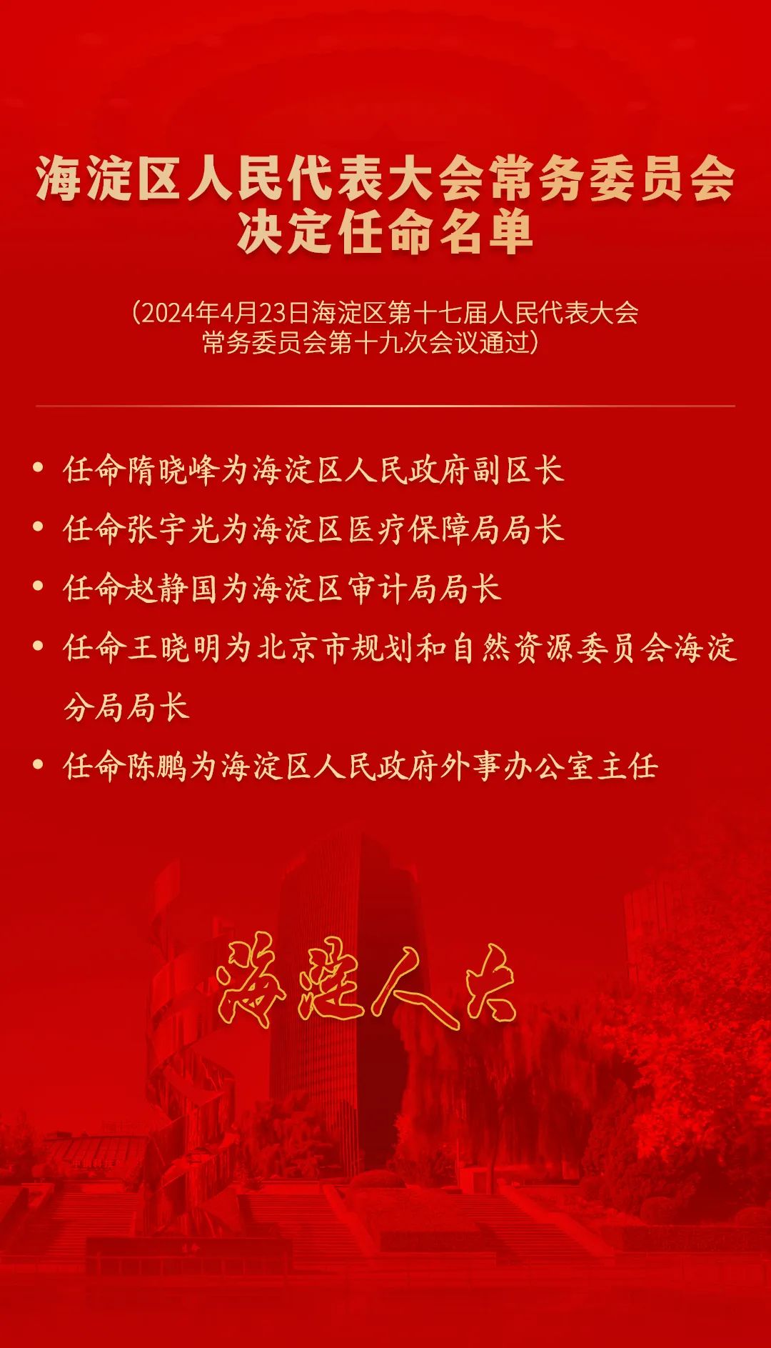 4月23日上午,海淀区第十七届人大常委会第十九次会议决定,任命隋晓峰为海淀区人民政府副区长。区人大常委会主任刘长利主持会议。