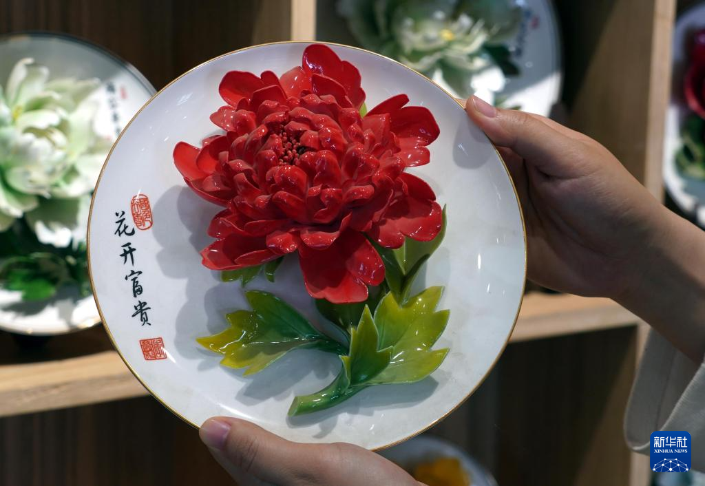 4月16日,在洛阳牡丹阁拍摄的牡丹瓷纪念品。新华社记者 李安 摄