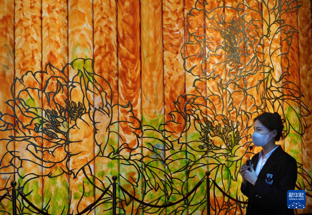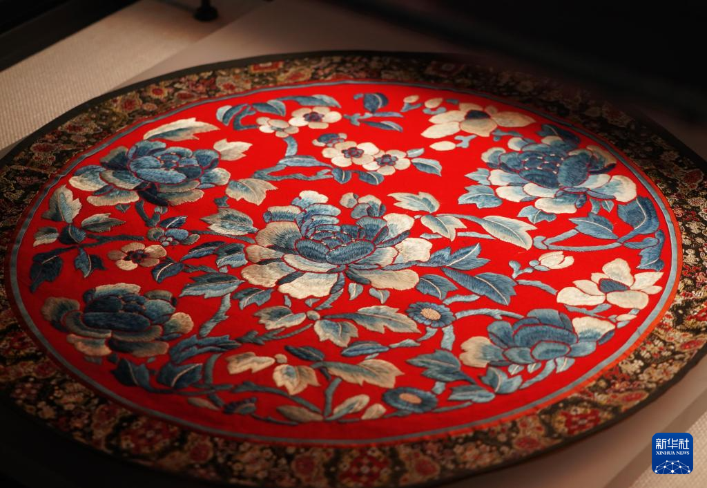 4月16日,在洛阳牡丹阁拍摄的带有牡丹元素的展品“平安富贵绣片”。新华社记者 李安 摄