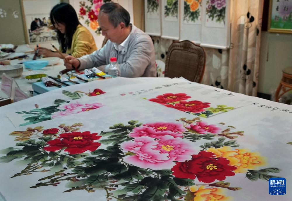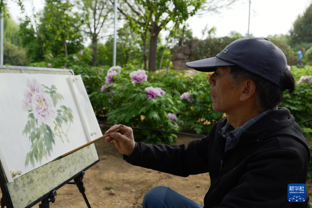 4月16日,画师在河南省洛阳市国家牡丹园内进行牡丹画创作。新华社记者 李嘉南 摄