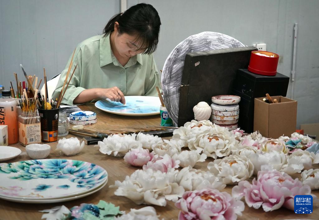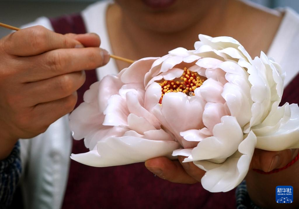 4月17日,洛阳牡丹瓷博物馆的工作人员在制作牡丹瓷。新华社记者 李安 摄